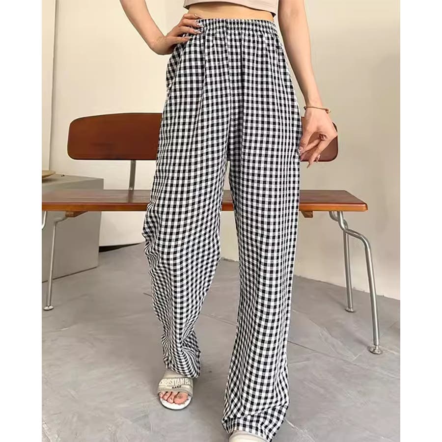 ギンガムチェック柄のルームウェアパンツは、