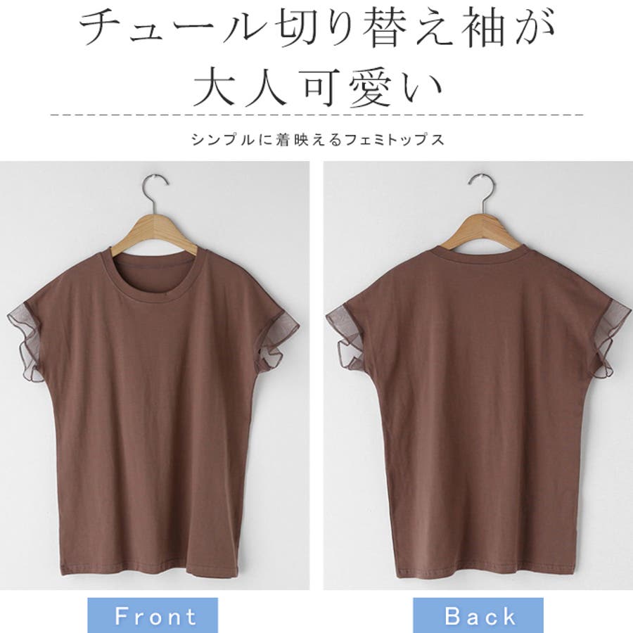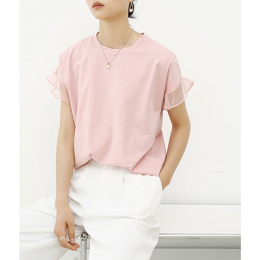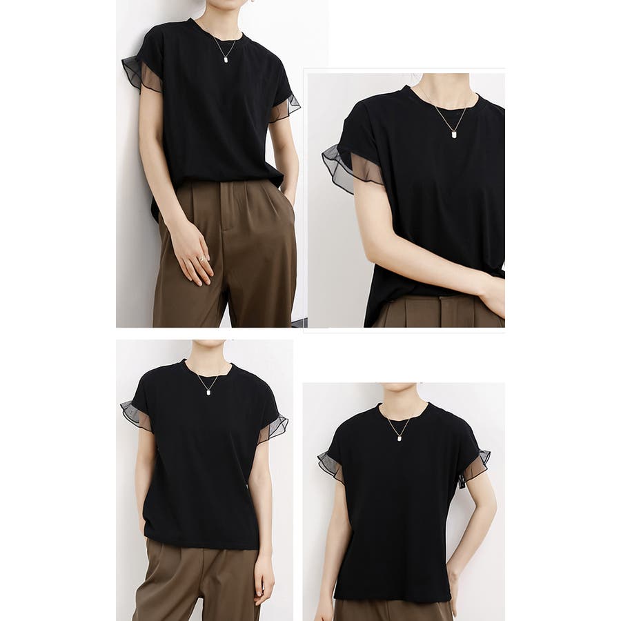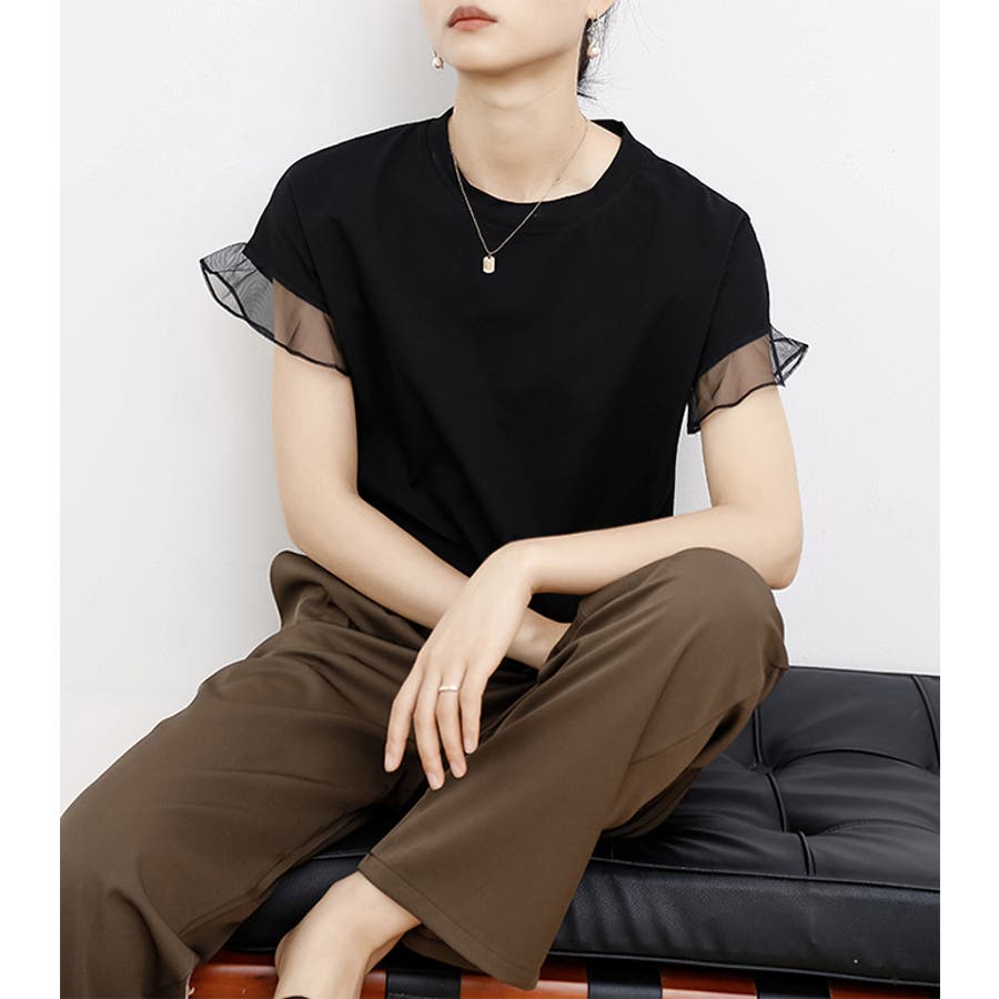 袖口に施されたチュールフリルデザインがオシャレ、シンプルコーデに華やかさをプラス。
