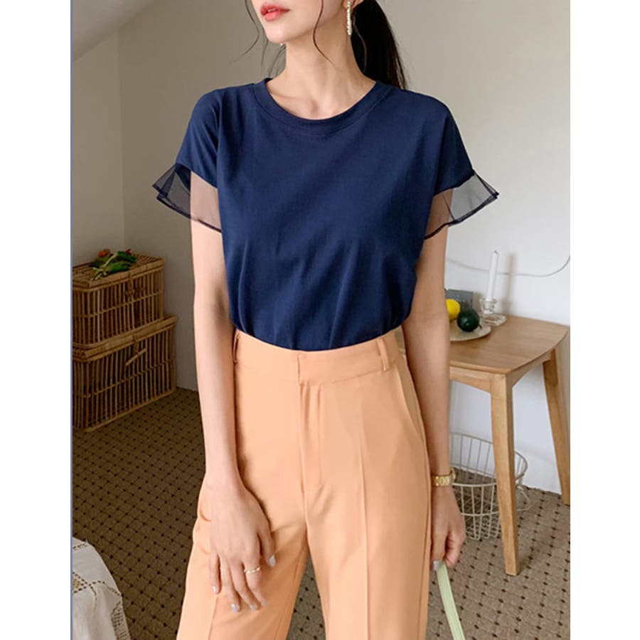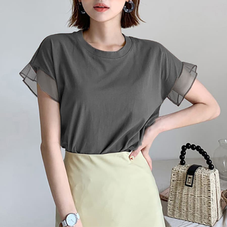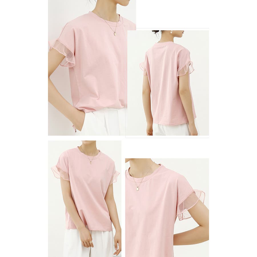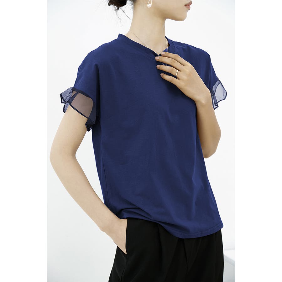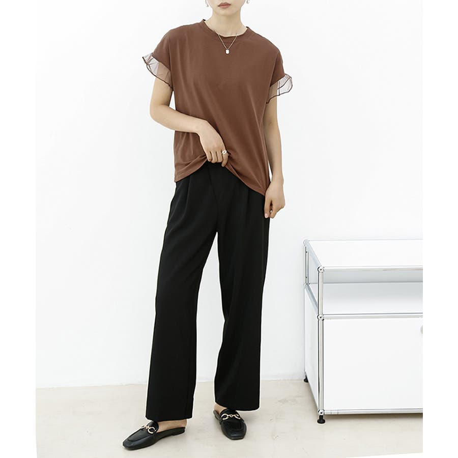 袖口に施されたチュールフリルデザインがオシャレ、シンプルコーデに華やかさをプラス。