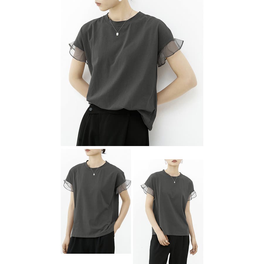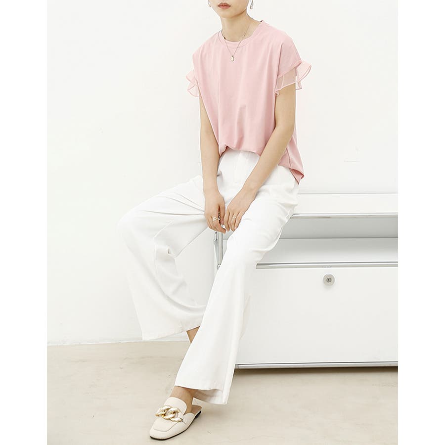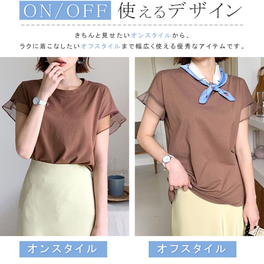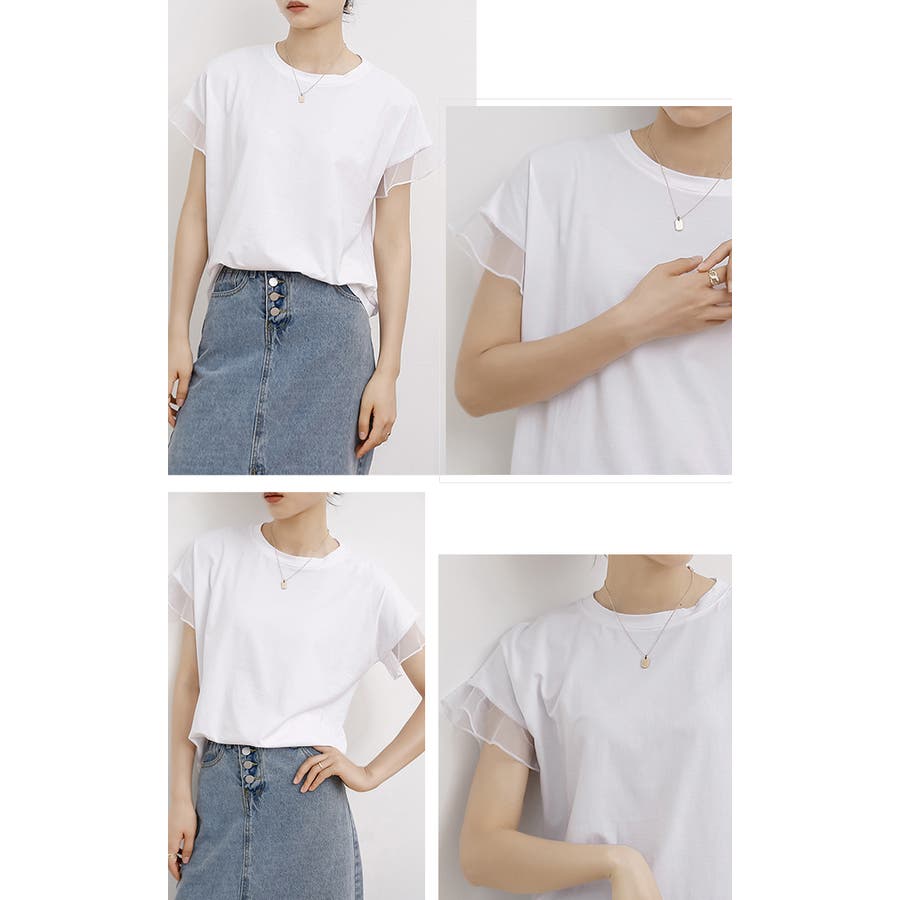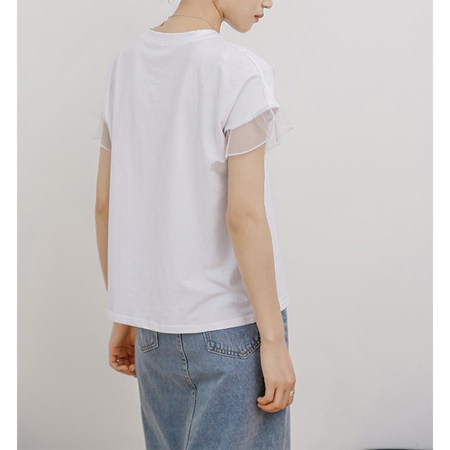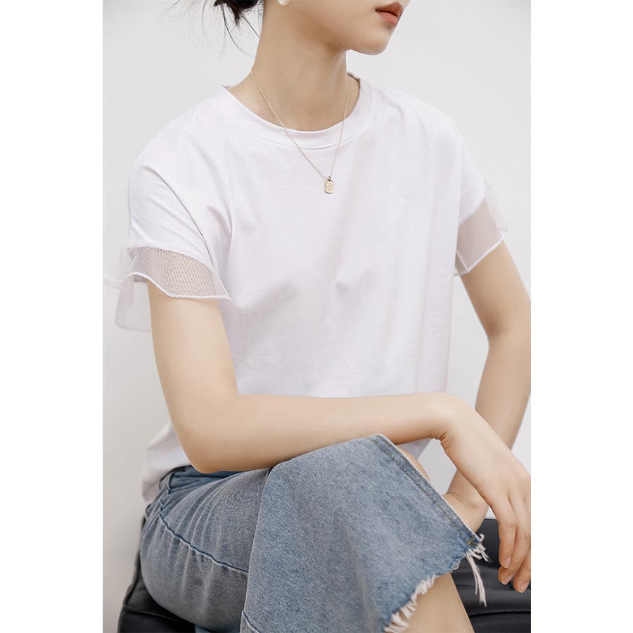 【ホワイト】チュールキリカエフリルスリーブTシャツ
