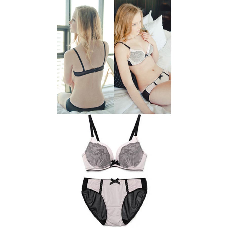 【C-style】【rz6097】4cmグラマラスマジックブラ♪ブラックレースとピンクメッシュがセクシーなミルキーピンクチュールブラセット(ショーツセット)