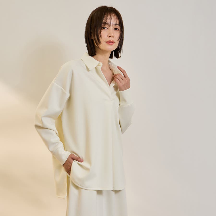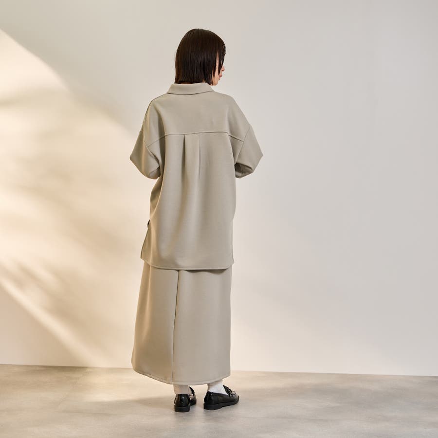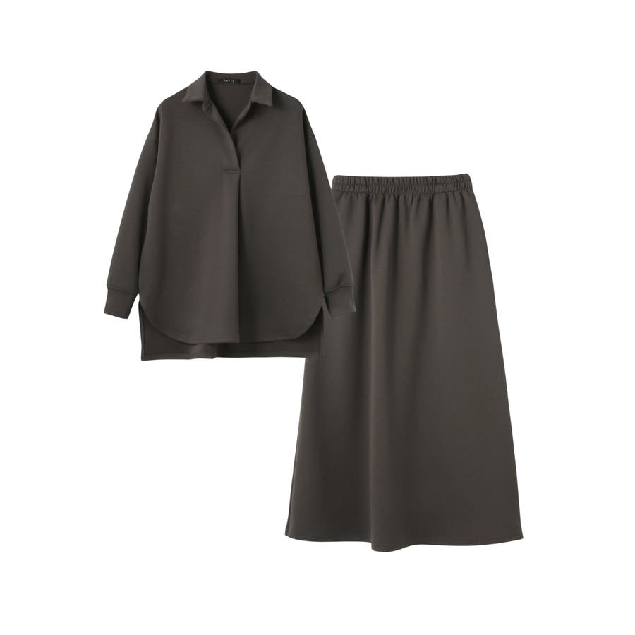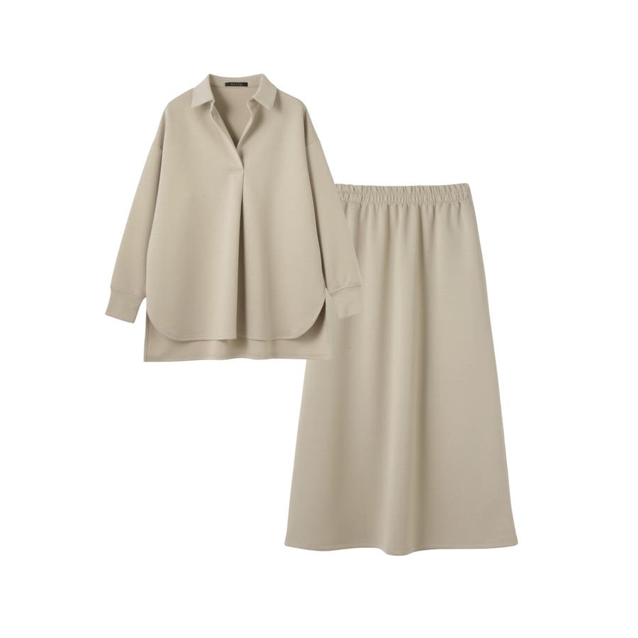 抜け感、ゆとりのあるリラクシーなスキッパーシャツとミニマルなセミフレアシルエットスカートの2ピースアイテムです。