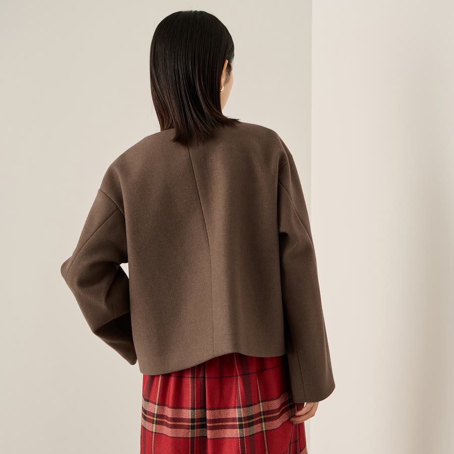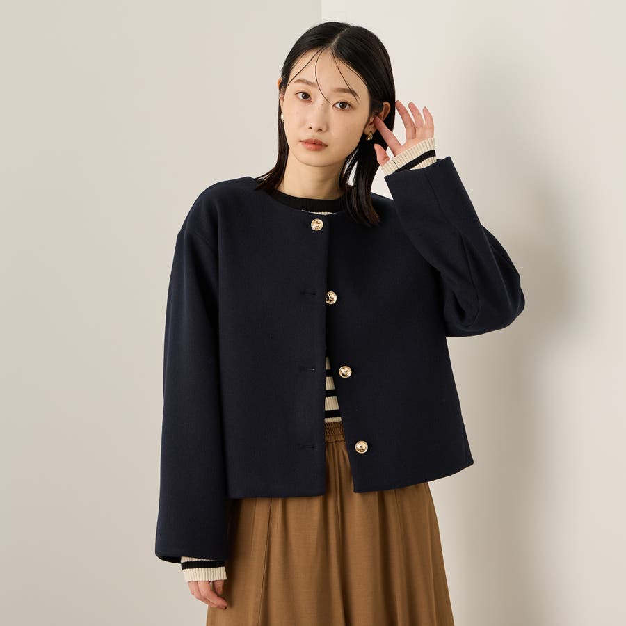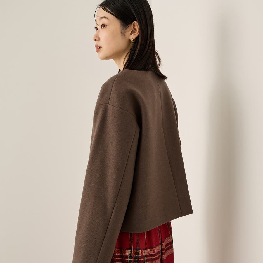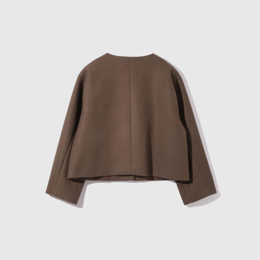 コンパクトに見えるフォルムながら、ドロップショルダーで動きやすさや着合わせやすさを考慮したデザインになっています。