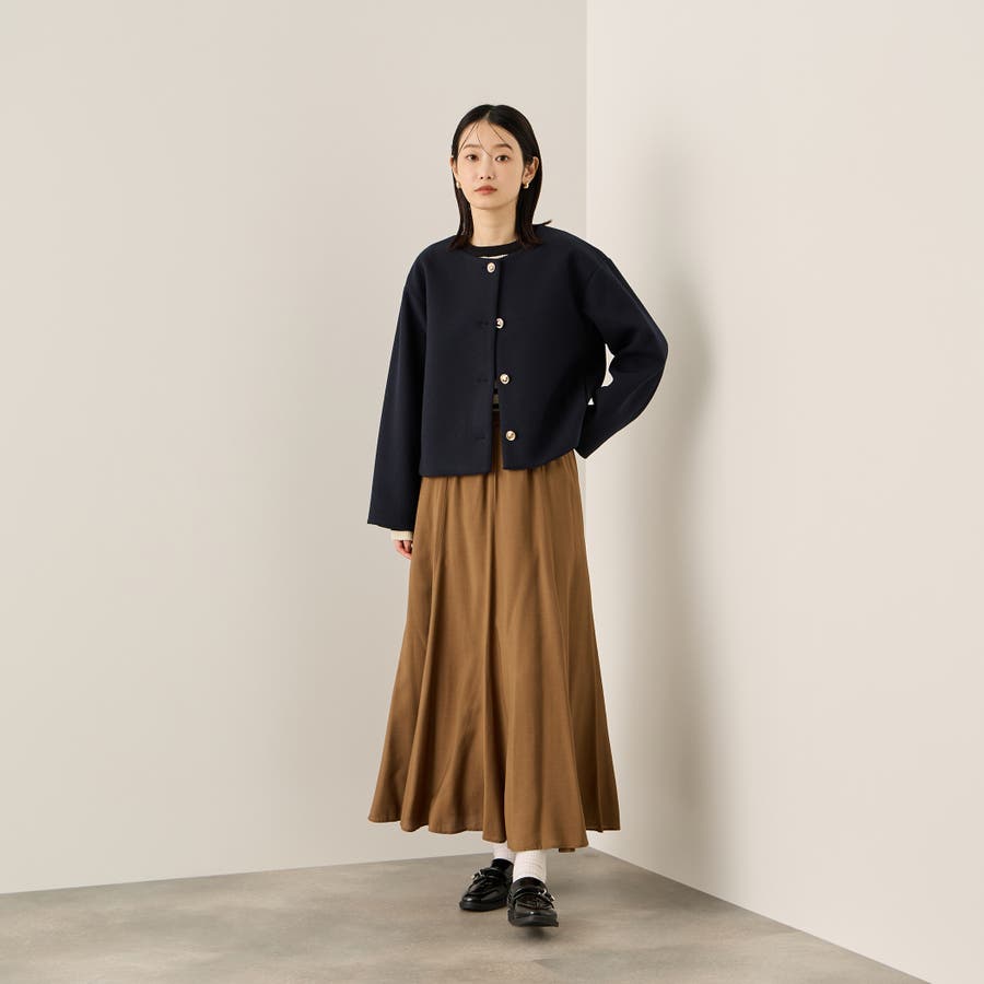 ペプラムシルエットなどヘム変化のあるトップスにあわせたり、ワイドパンツやフレアスカートなど、ボリュームのあるボトムスとあわせていただくのがおすすめです。