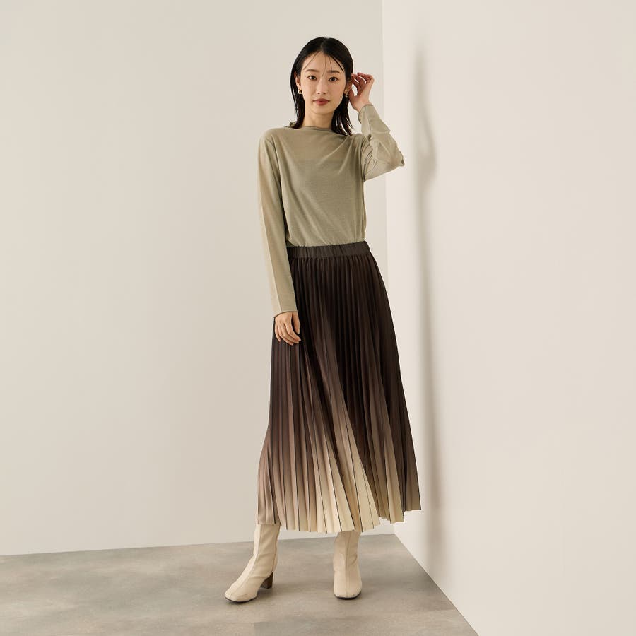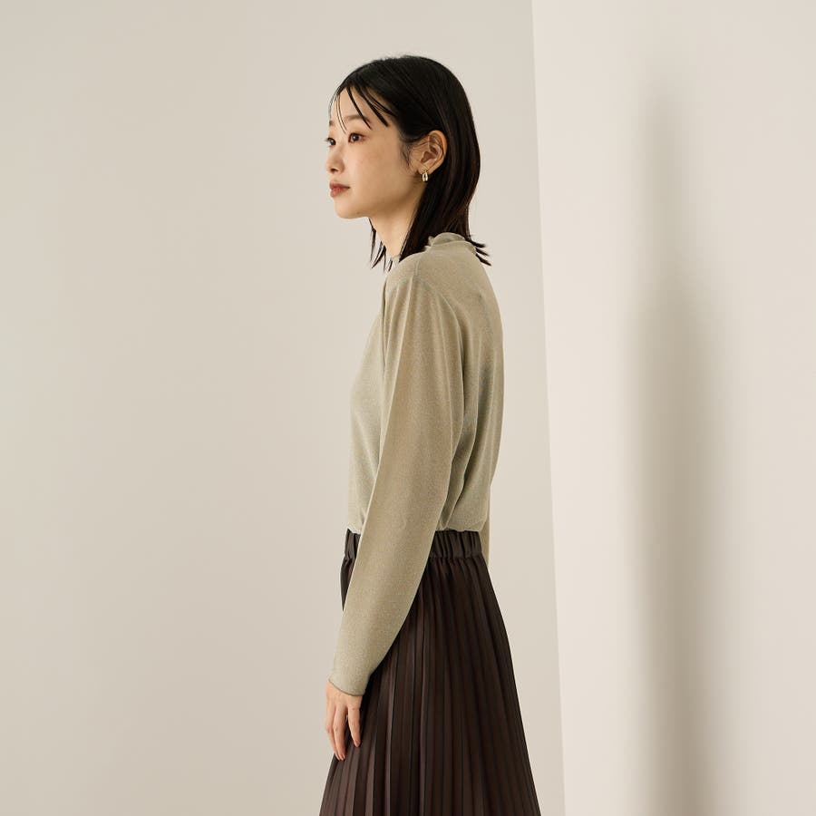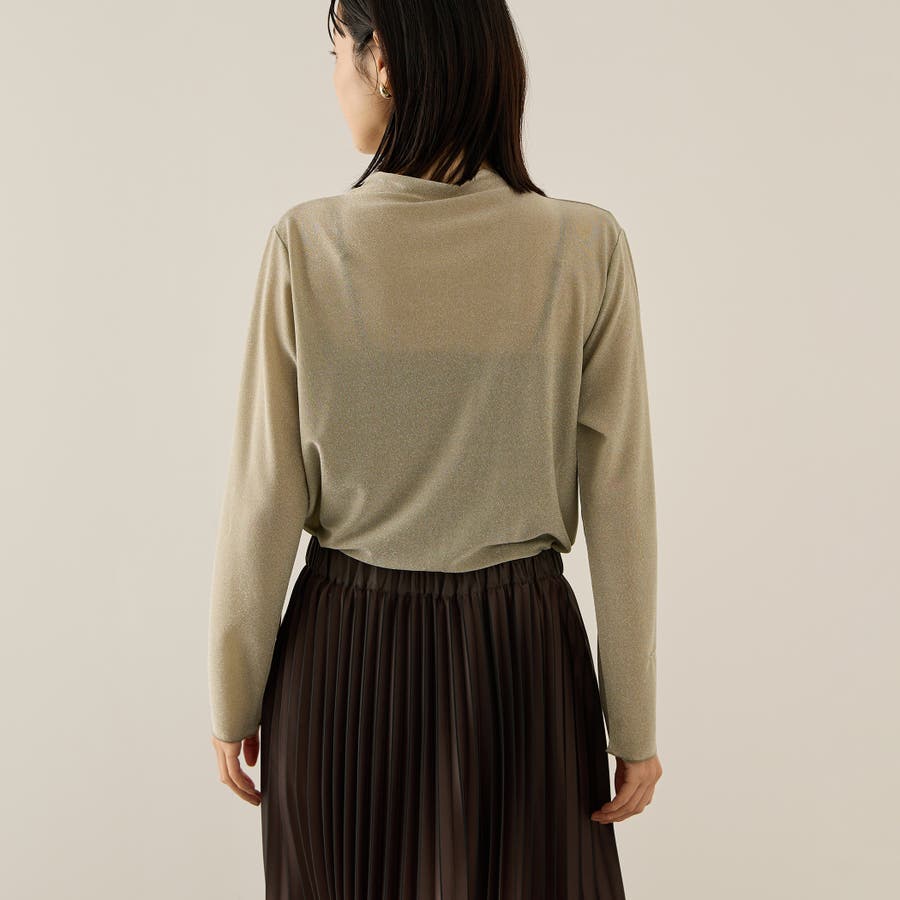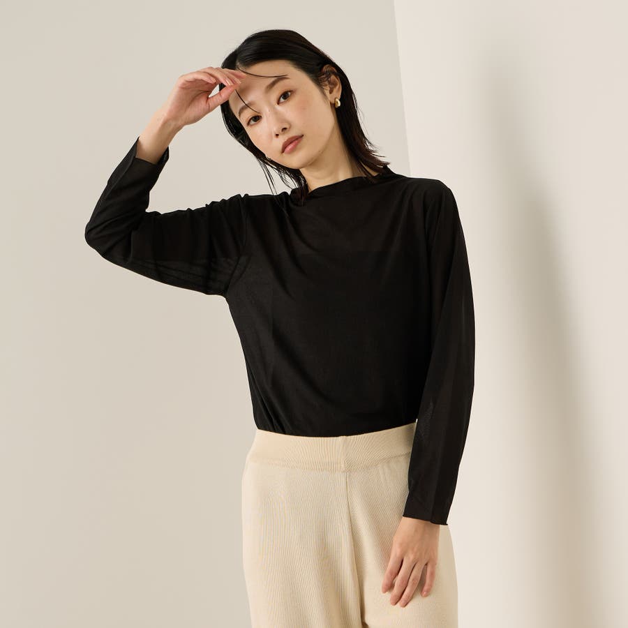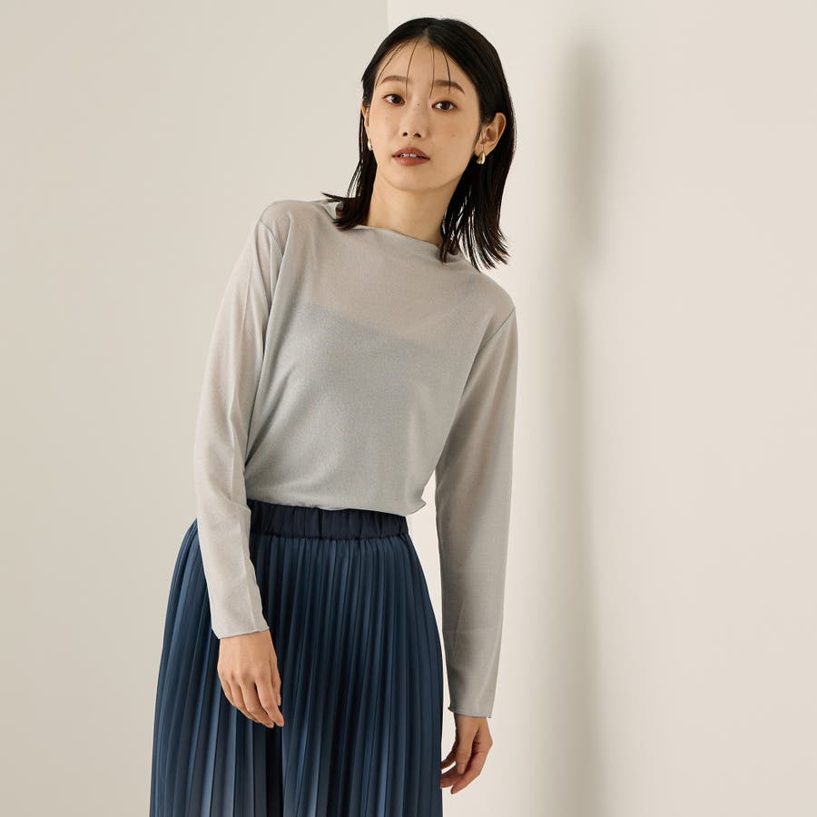 インナー使い、レイヤードスタイルに便利なセミシアーのボトルネックカットソーは、細やかなラメが煌めくスタイリングのアクセントに。気温が高い日には、ニュアンス感のあるストラップデザインのインナーとのレイヤードスタイルで、気温が落ち着いて着たら、ジャケットやニットのインナーとして抜け感のあるスタイリングを演出します。