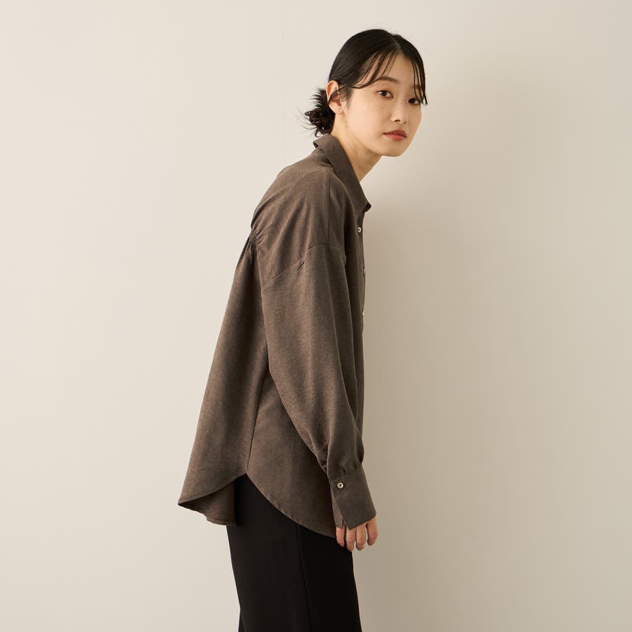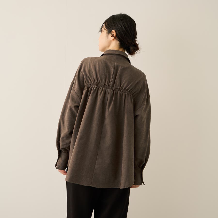 素材感を楽しんでいただくように、バックギャザーデザインをいれて着こなしに立体感を与えながら、ハイネックのトップスをインナーに入れたレイヤードスタイルもしやすいよう見た目はミニマルに。
