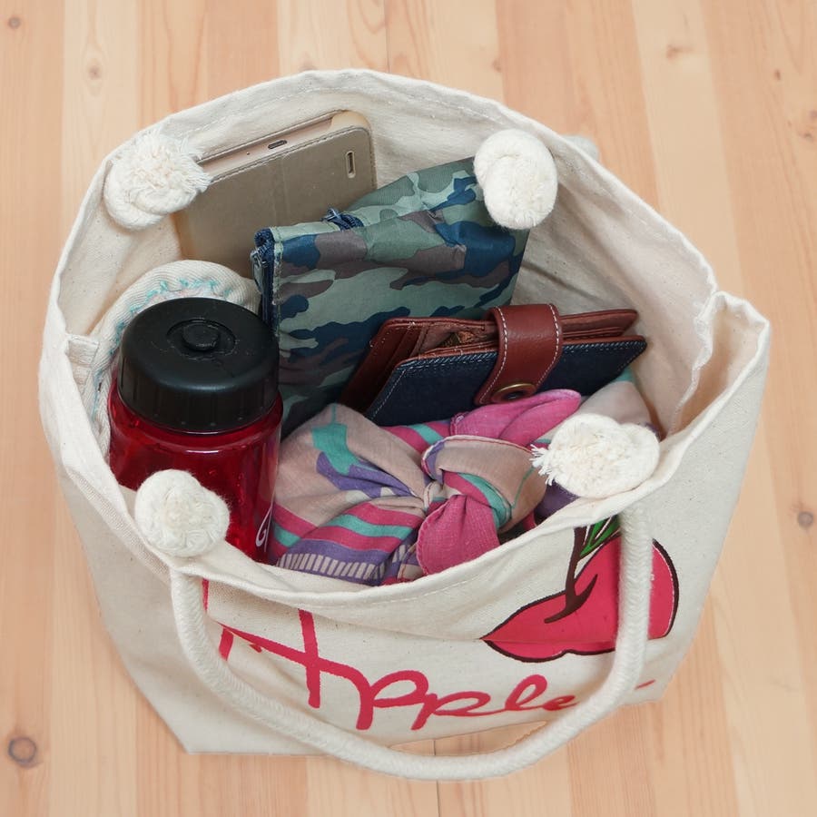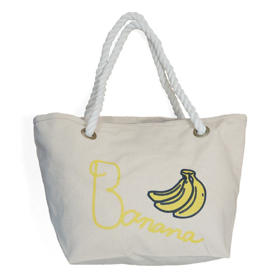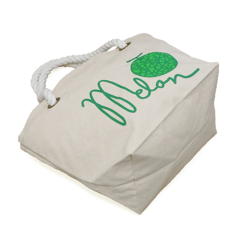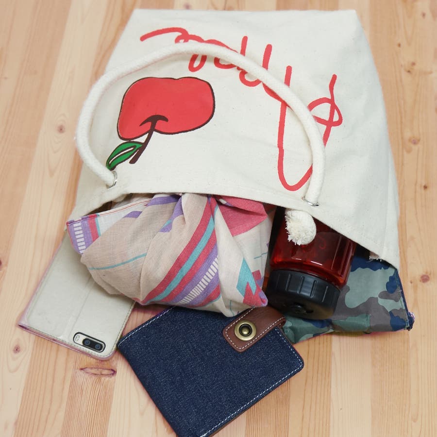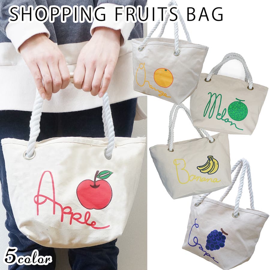 軽いキャンバス生地にねじったロープの持ち手が可愛いデザイン。カラフルなロゴとフルーツがお洒落のポイントになります。
