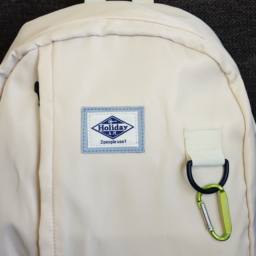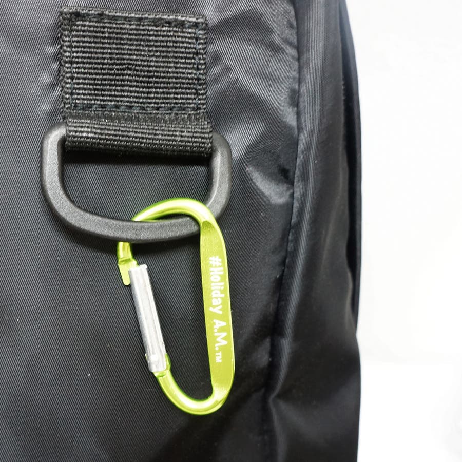 HolidayA.M.ホリデーエーエムのネームタグは反射板に重ねられていて事故防止の役割もあり、お洒落。また、ネオングリーンカラーのカラビナがアクセントになっています。