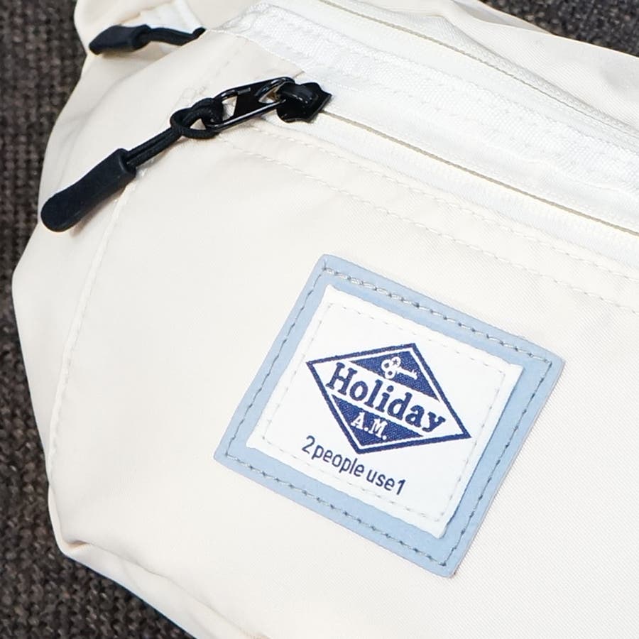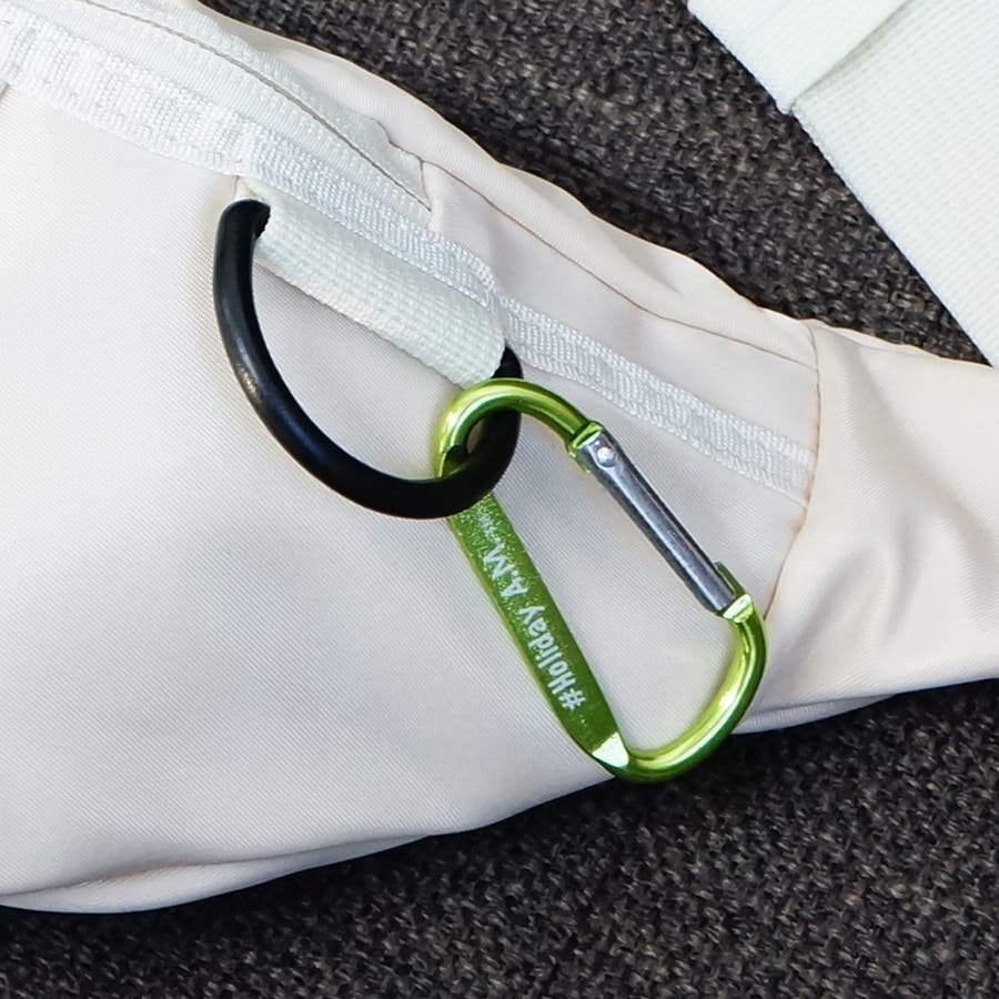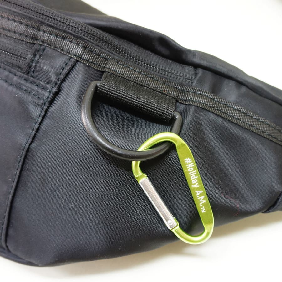 HolidayA.M.ホリデーエーエムのネームタグは反射板に重ねられていて事故防止の役割もあり、お洒落。また、ネオングリーンカラーのカラビナがアクセントになっています。