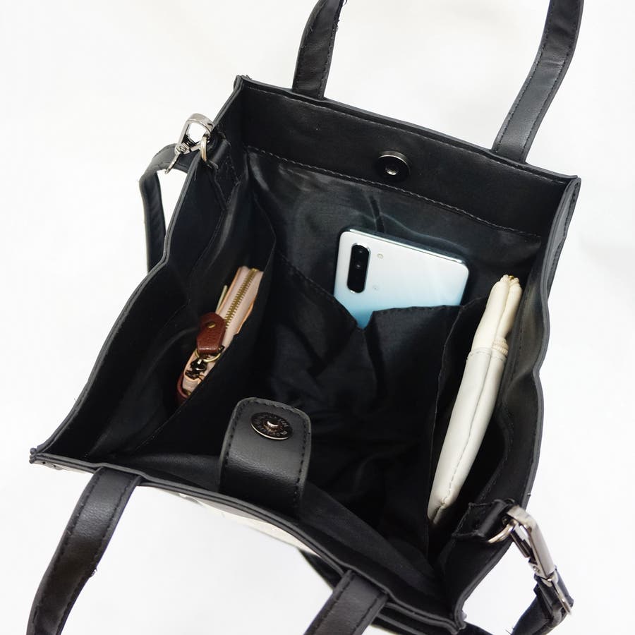 | 素材 | サイズ:タテ23cmxヨコ22-16.5cmx幅10-20cm、持ち手長さ:30cm、ショルダー長さ:68-124cm 仕様:内ポケット×3 素材:合成皮革(本体)、ポリエステル(裏地) |