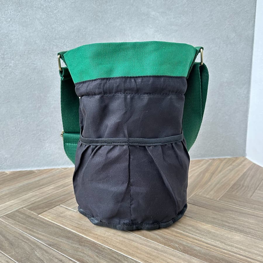ヒモをしぼった巾着スタイル、ヒモを伸ばしたバケツ型バッグとしての使い方ができ、ショルダーを短くしたり長くしたりして肩掛け、斜め掛けができます。