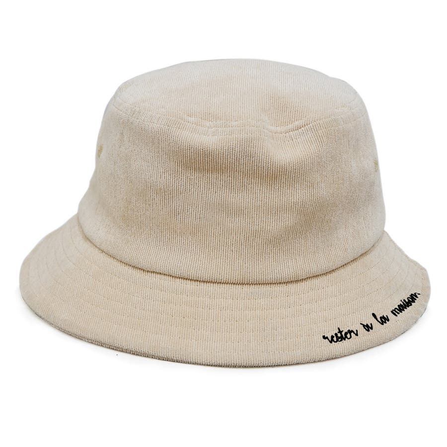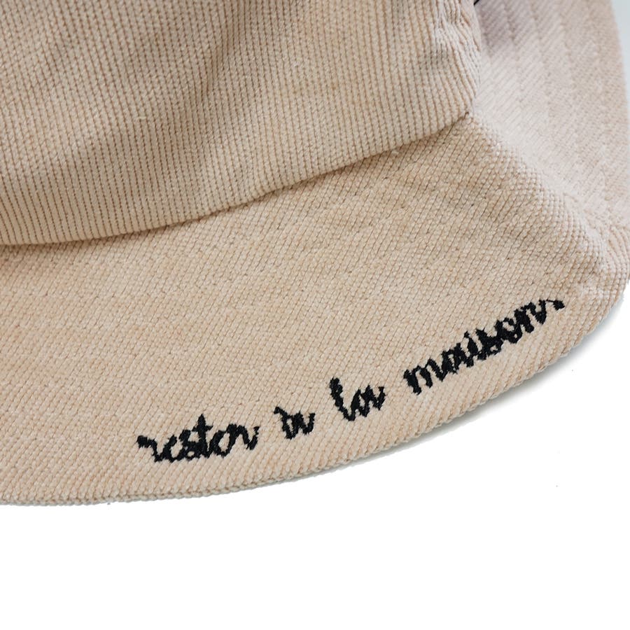ツバのカーブに沿って「rester la maison」の文字をデザインした刺繍がアクセントになって、シンプルながら他とはちょっと違う帽子に仕上がっています。
