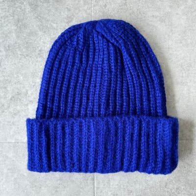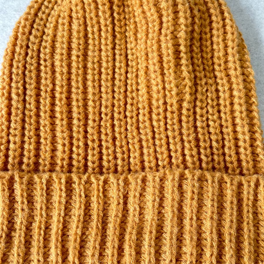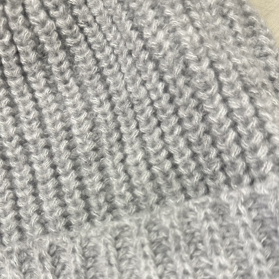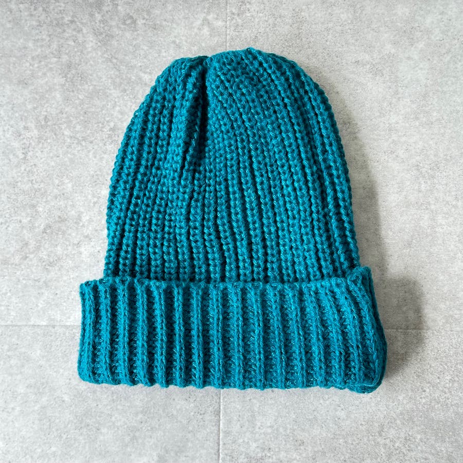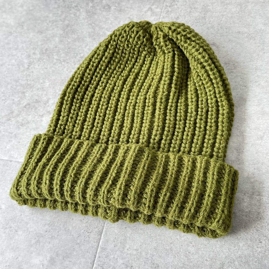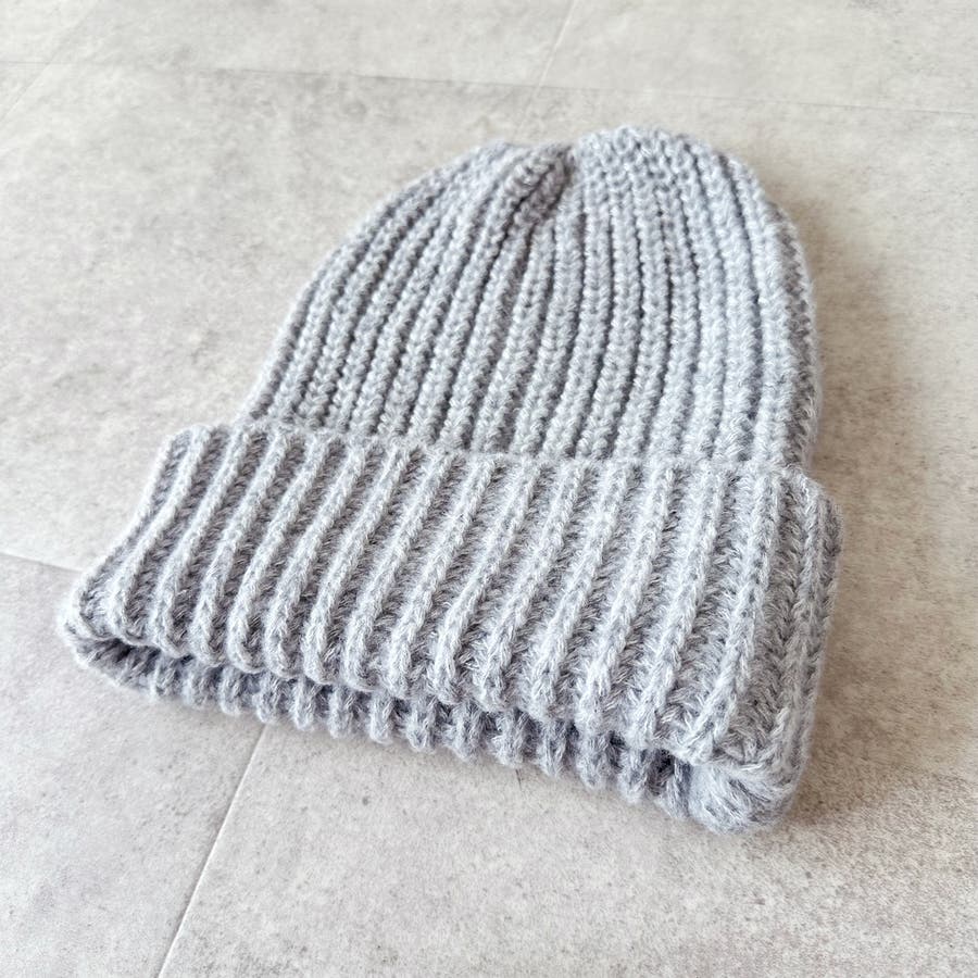 少し太めの毛糸を使用し伸縮性のあるリブ編みデザイン。しっかり被れてフワフワ、モコモコの被り心地です。