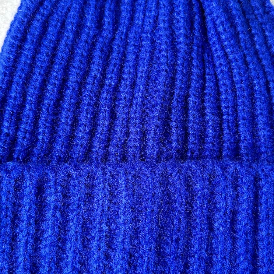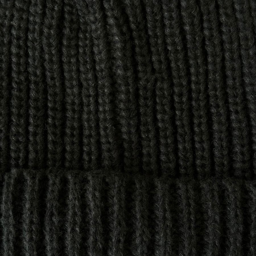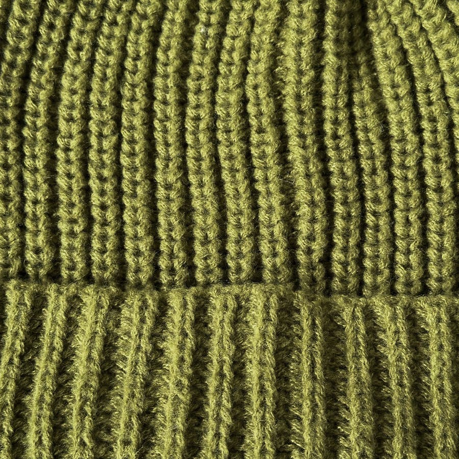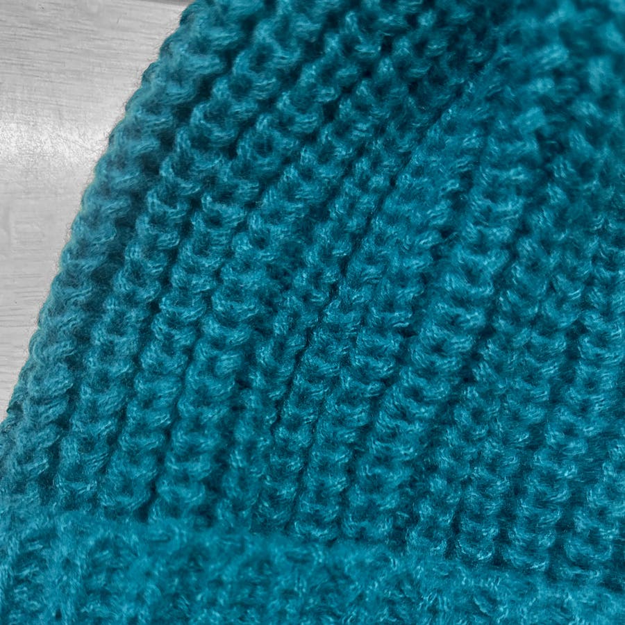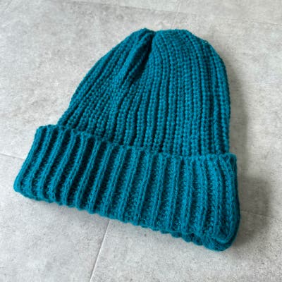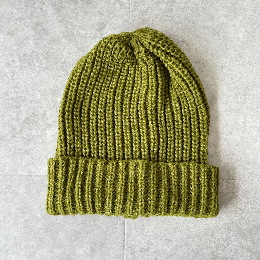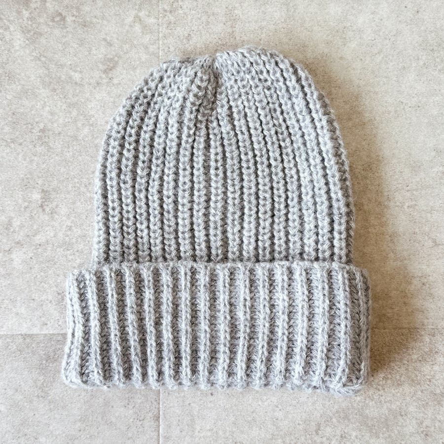 少し太めの毛糸を使用し伸縮性のあるリブ編みデザイン。しっかり被れてフワフワ、モコモコの被り心地です。