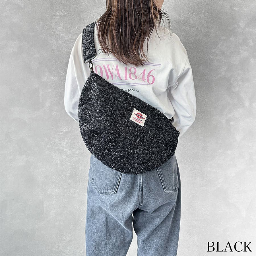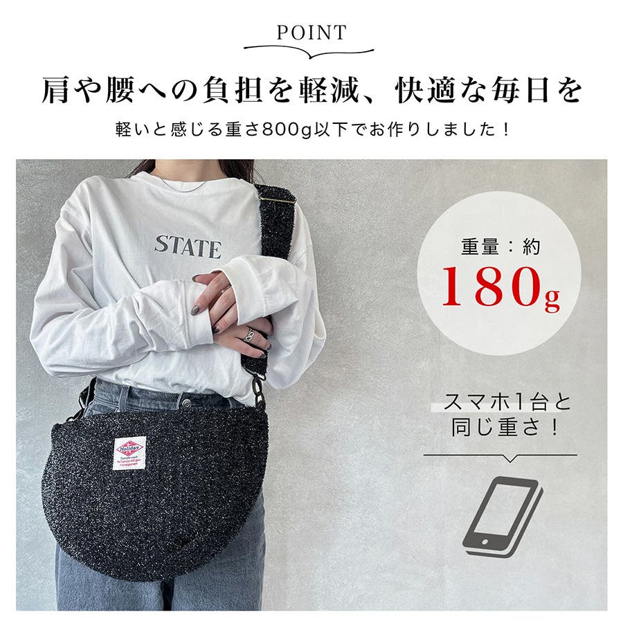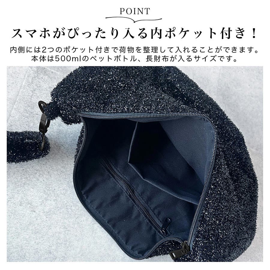 毛足の長いラメ糸で動きのある素材感がお洒落。シンプルなカラーで合わせやすくデイリーからお出掛けに持つだけでアクセントになるバッグです。