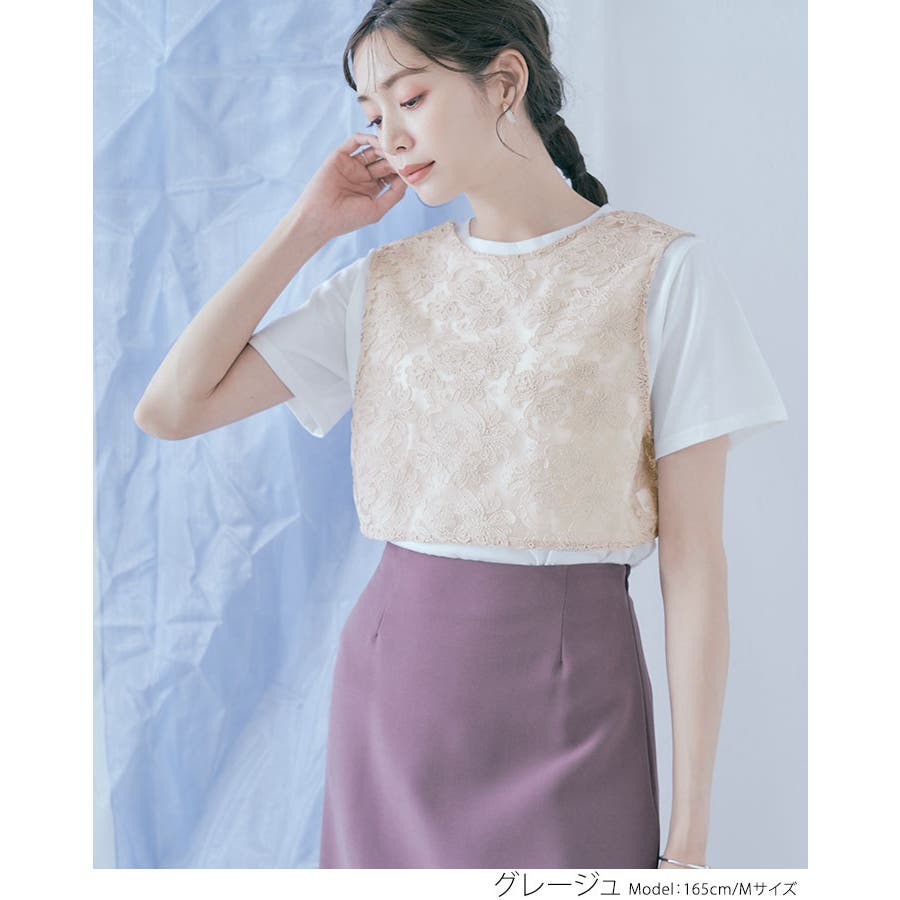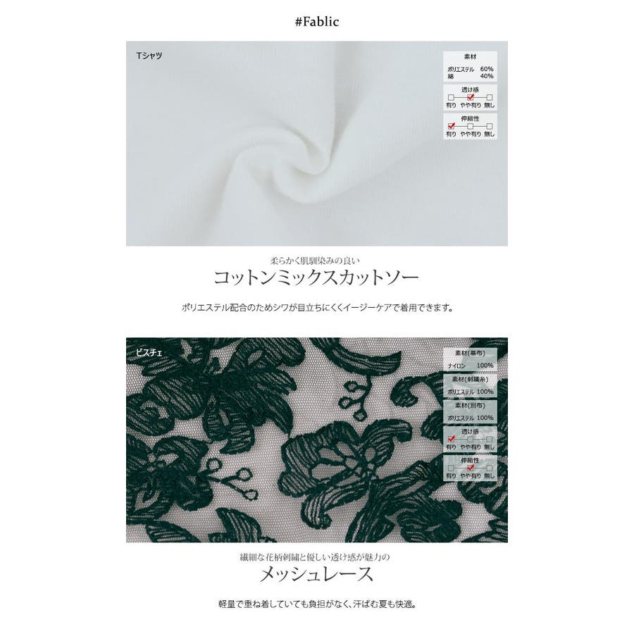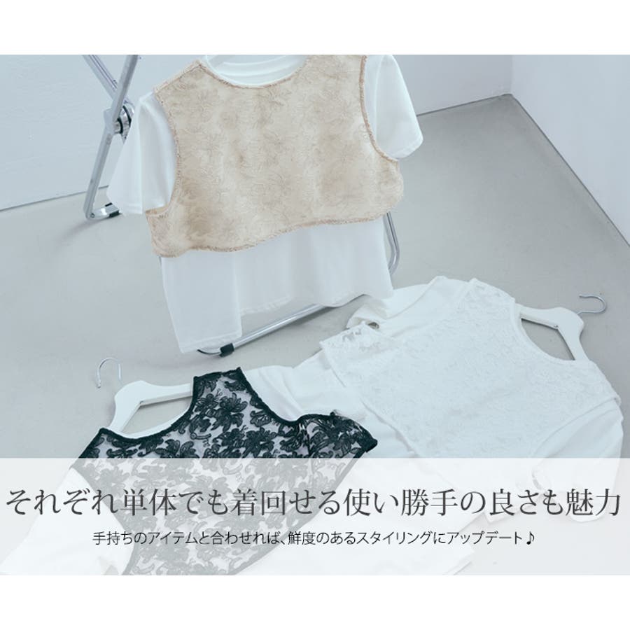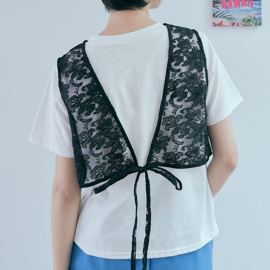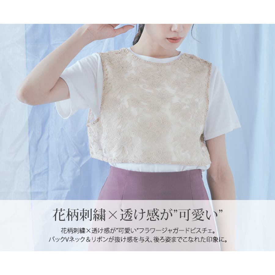 ●ビスチェ:繊細な花柄刺繍と優しい透け感が魅力のメッシュレース。軽量で重ね着していても負担がなく、汗ばむ夏も快適。