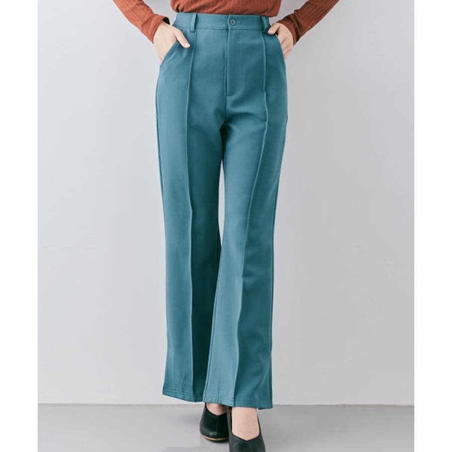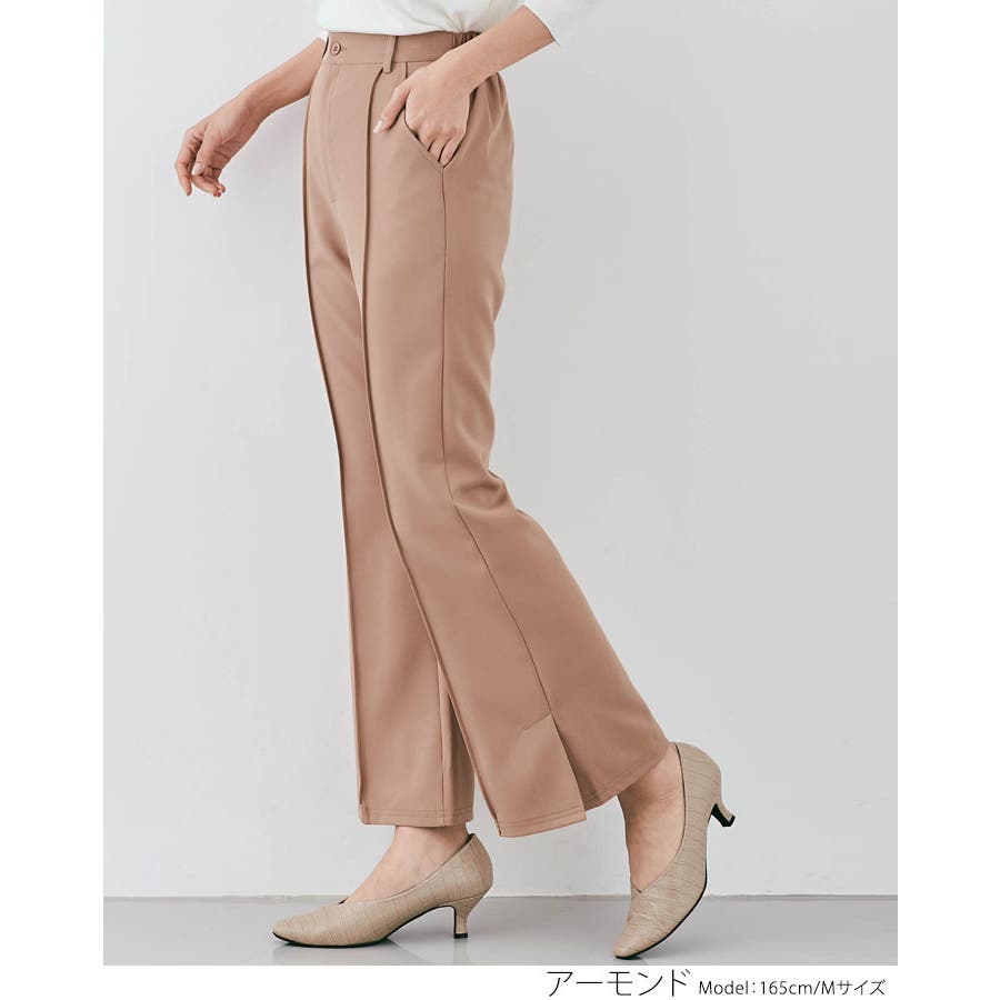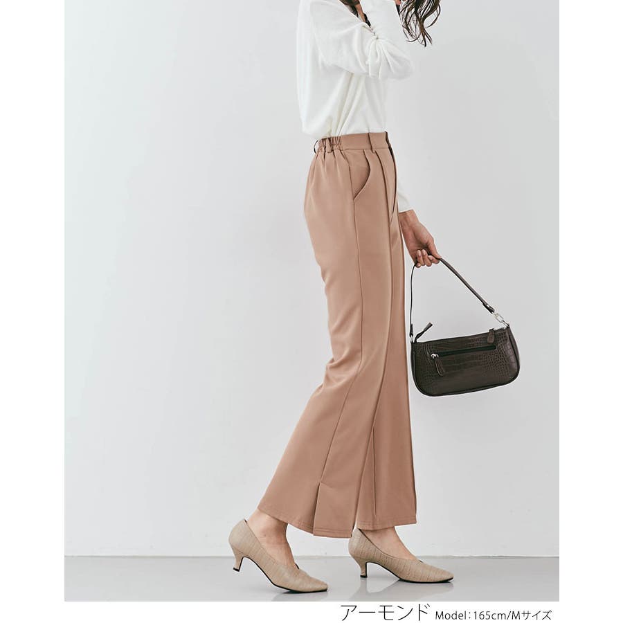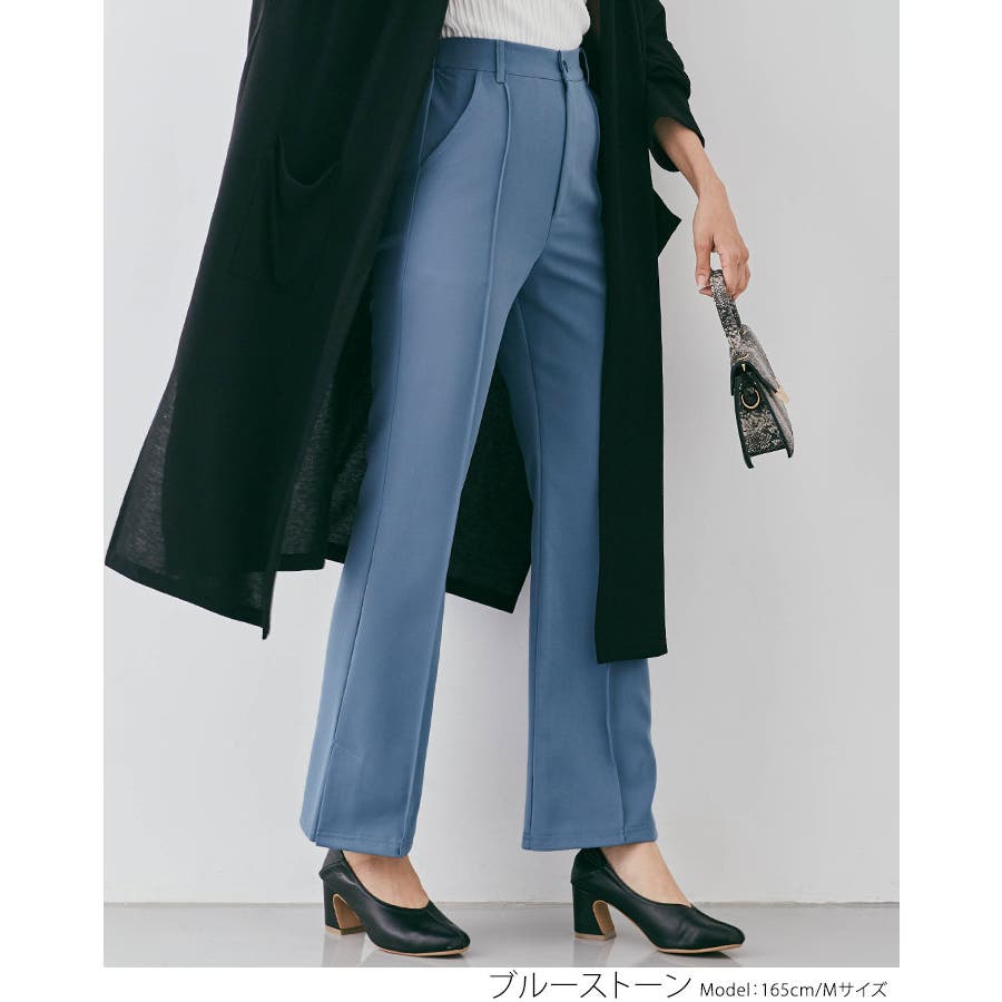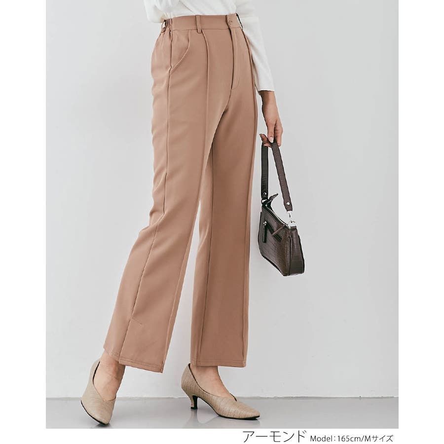●適度にゆとりを持たせたセミワイドのフレアシルエットが今年らしいポイント。フロントピンタック&ハイウエストで縦ラインを強調し、すっきりとした美しいレッグラインをメイク!