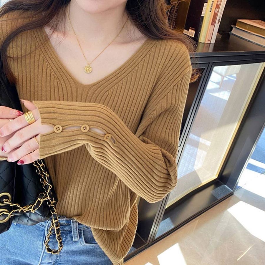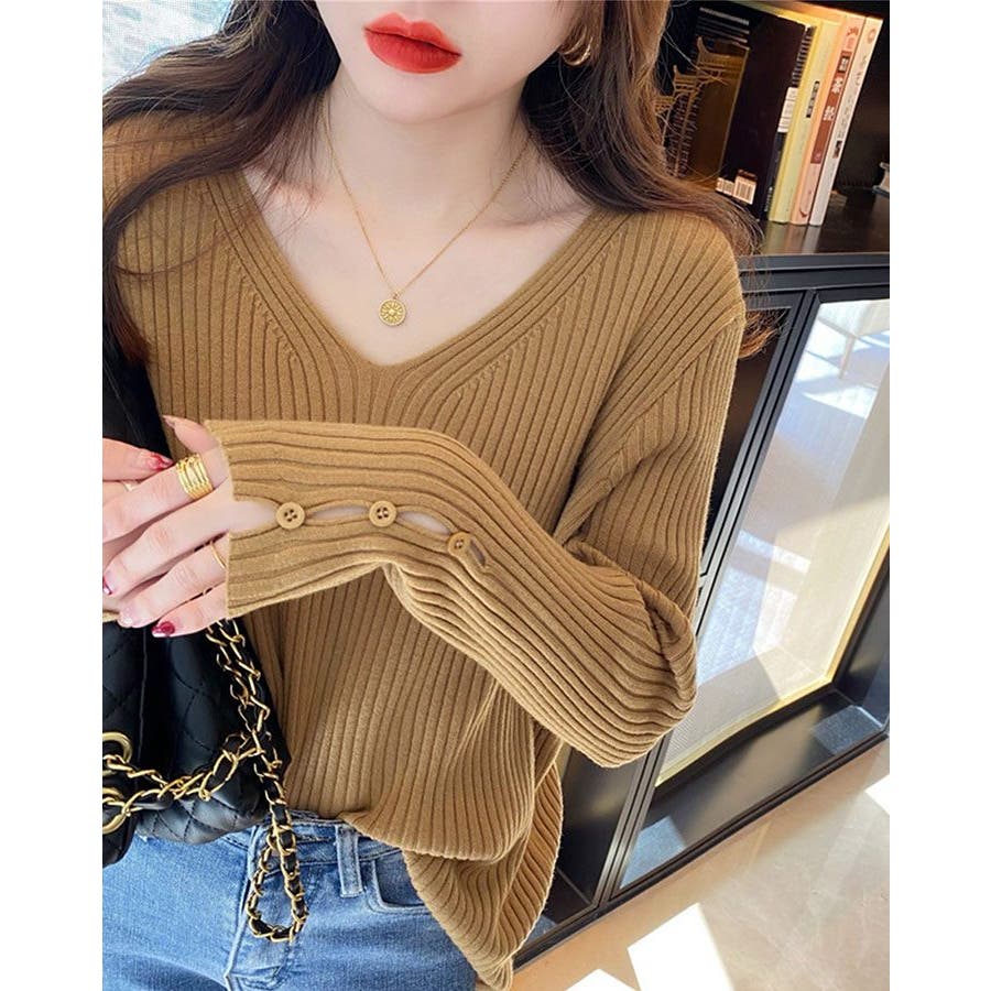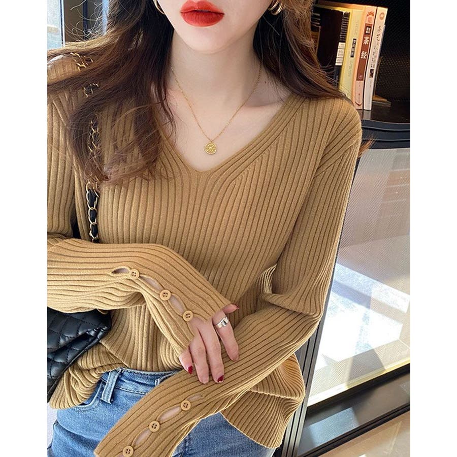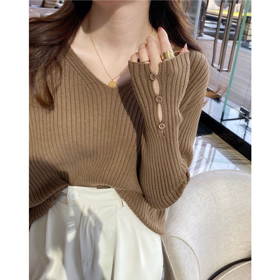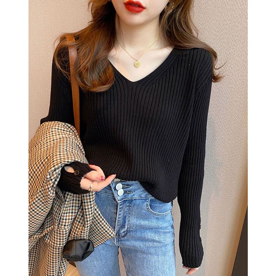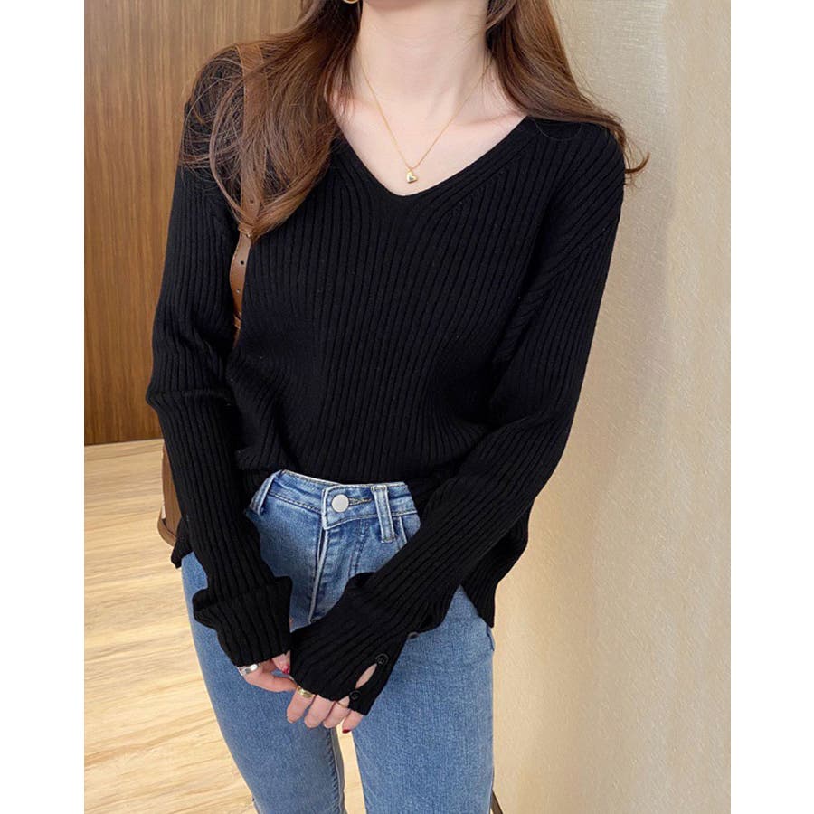【ブラック】袖ボタンVネックリブニット トップス リブニット