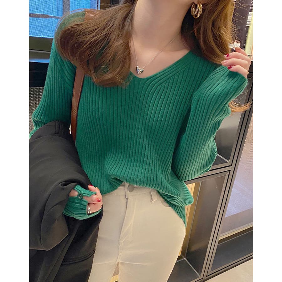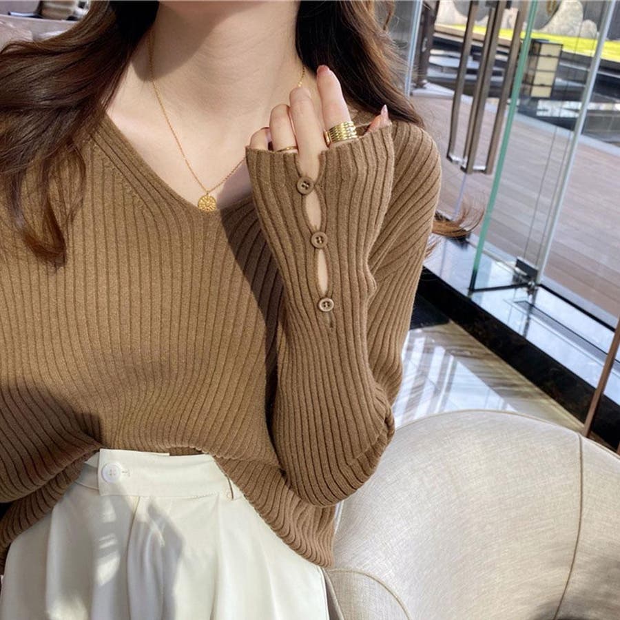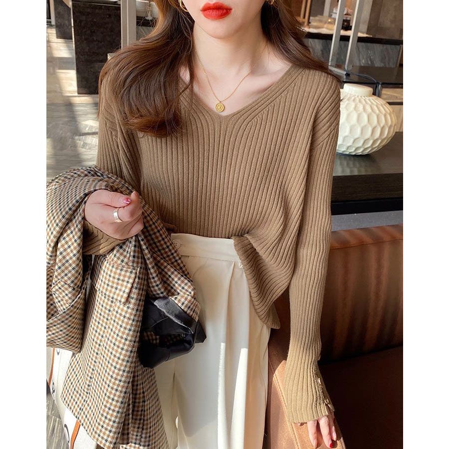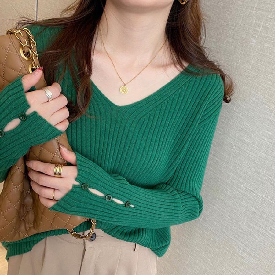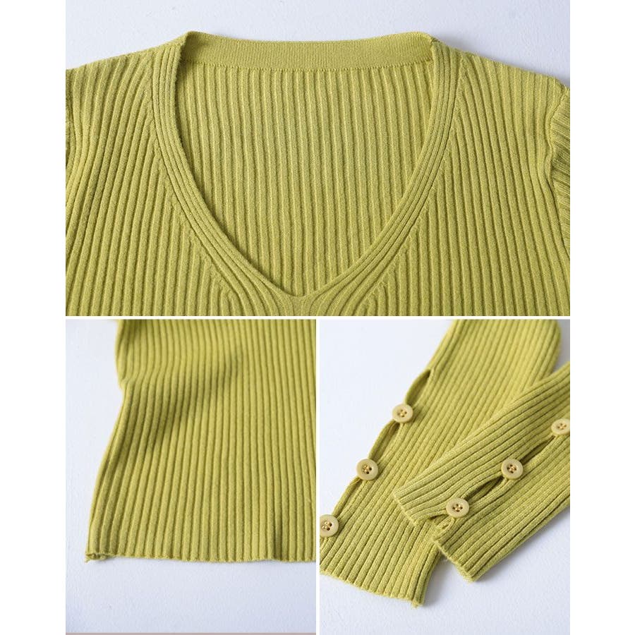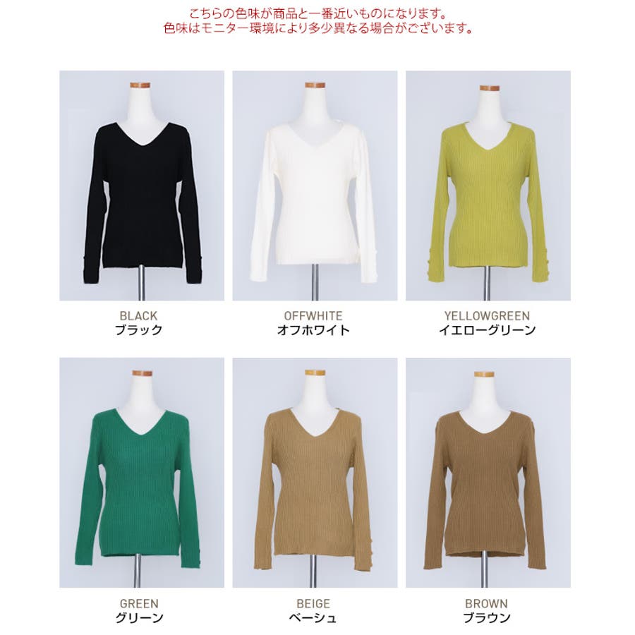 【ブラック】袖ボタンVネックリブニット トップス リブニット
