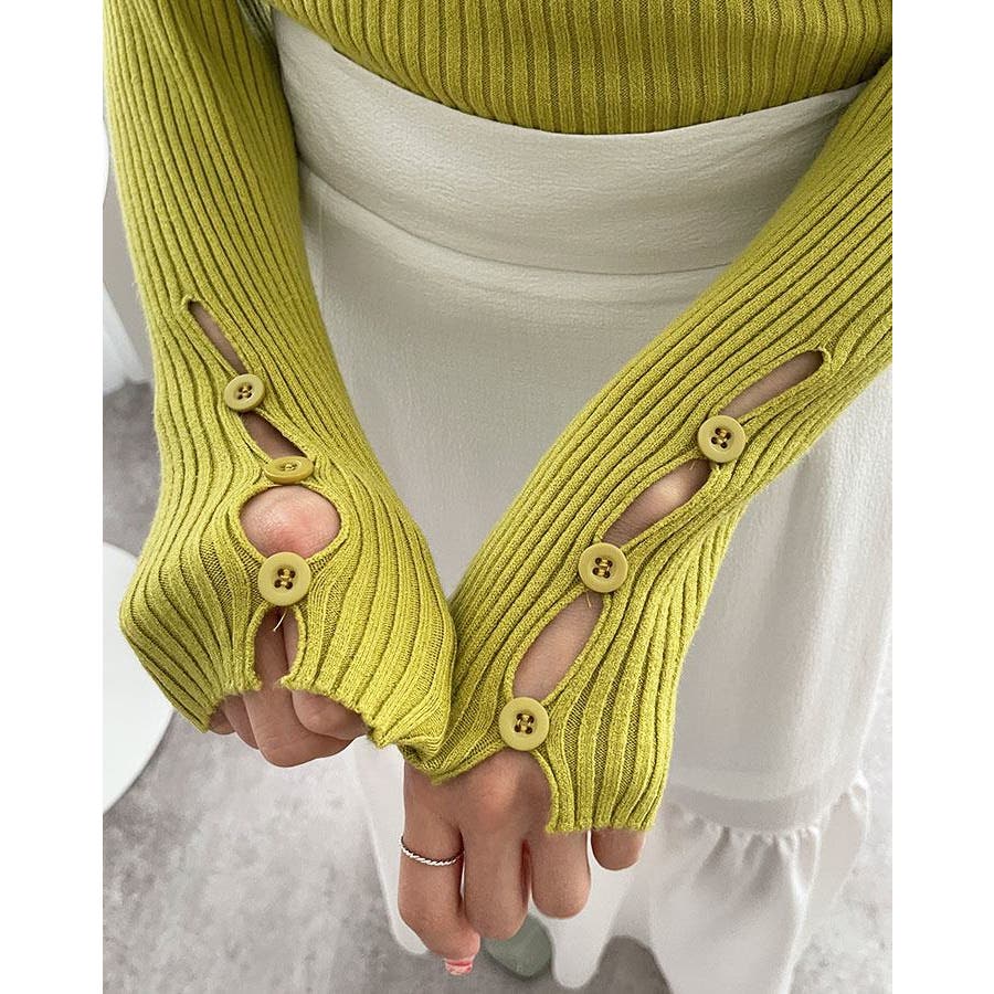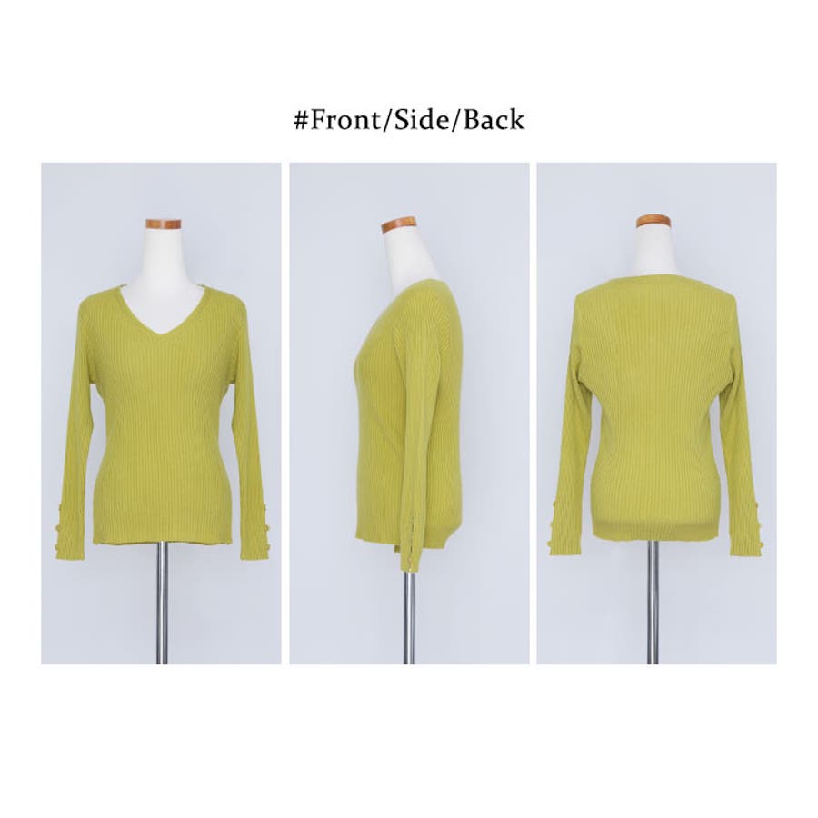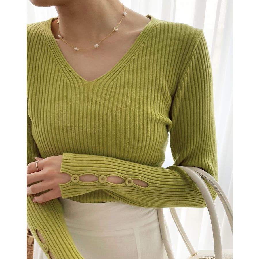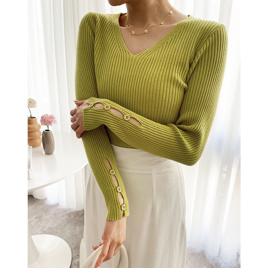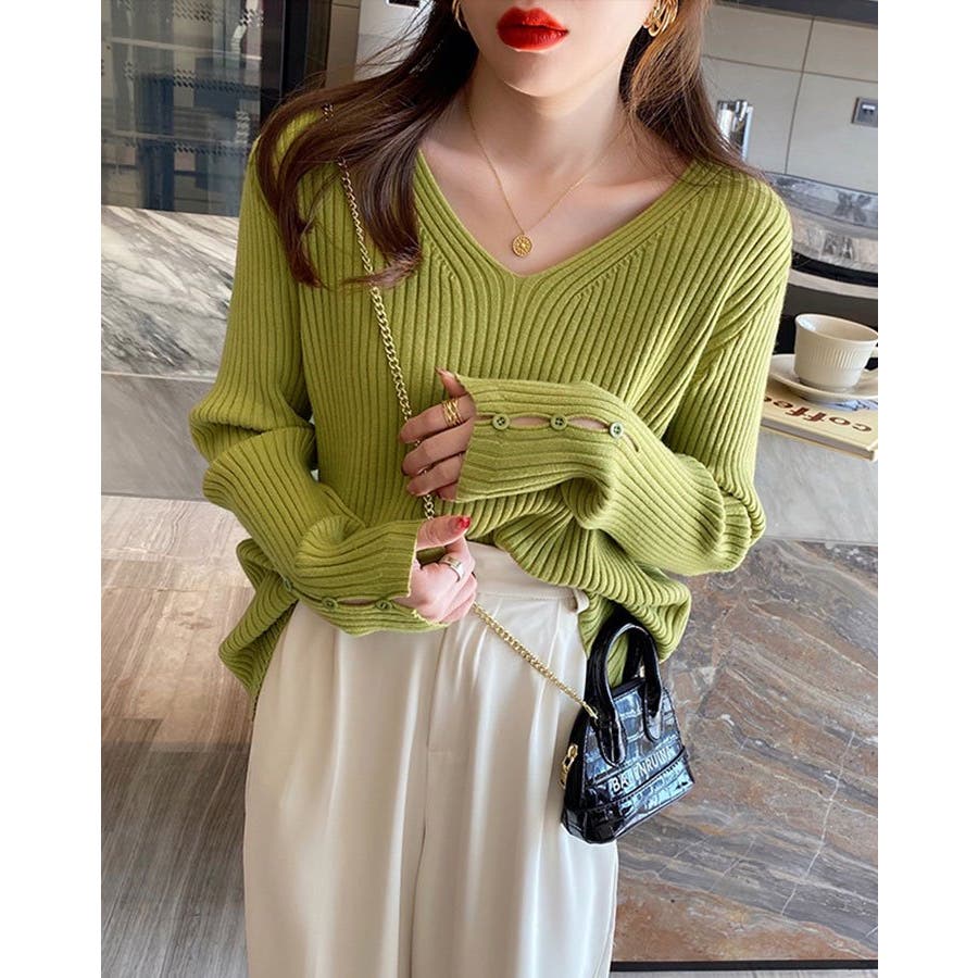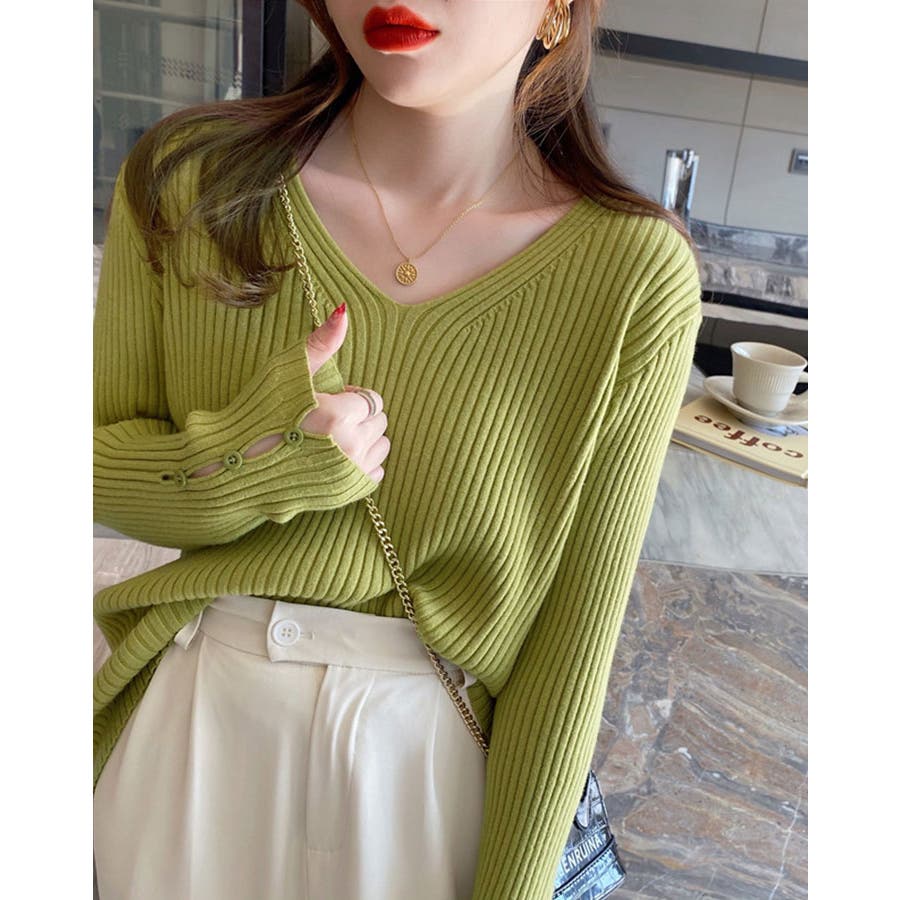 【ブラック】袖ボタンVネックリブニット トップス リブニット