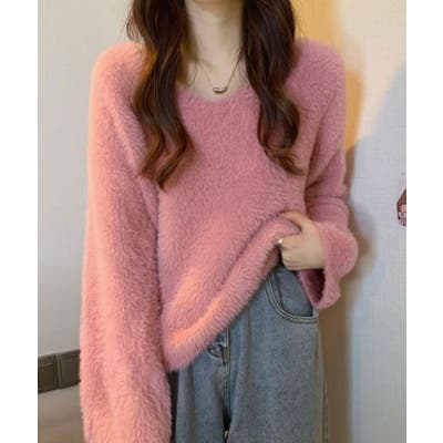 【ライトピンク】Vネックシャギーニットプルオーバー トップス ニット