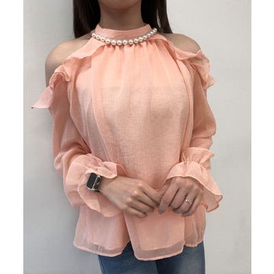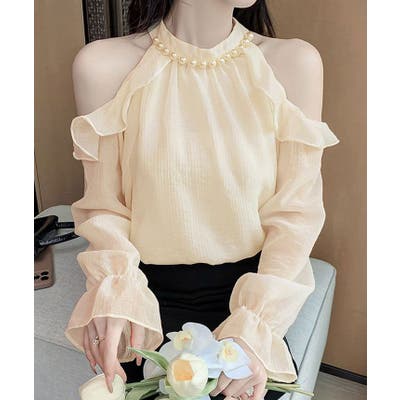キラッと輝く大粒のパールをあしらった、フェミニンさ溢れるホルターネックブラウス。