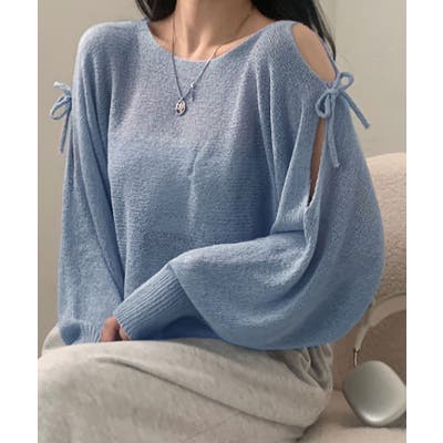 肩のリボンデザインが華やかで女性らしく、1枚でサマ見えするトップス。