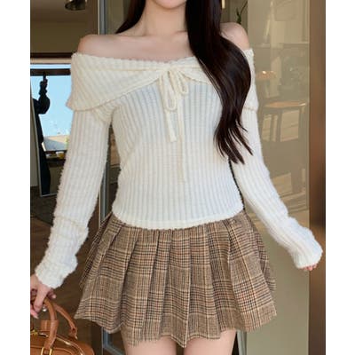 ふんわりとした肌触りとオフショルダーの抜け感が魅力のニット。