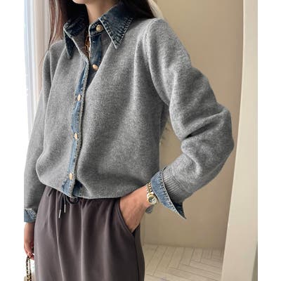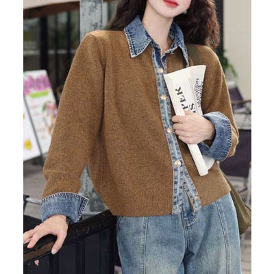 ・デニム調の襟・前立て・袖口をドッキングした、異素材ミックスのデザインカーディガン。