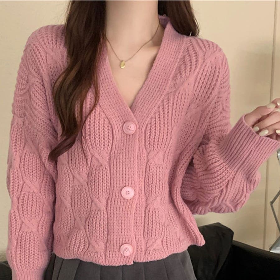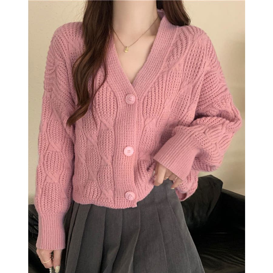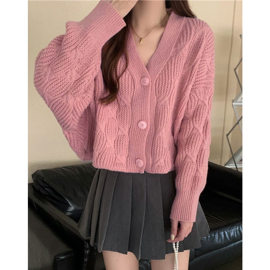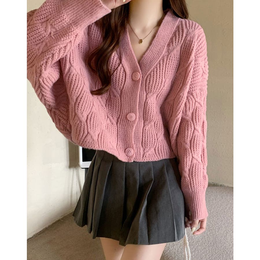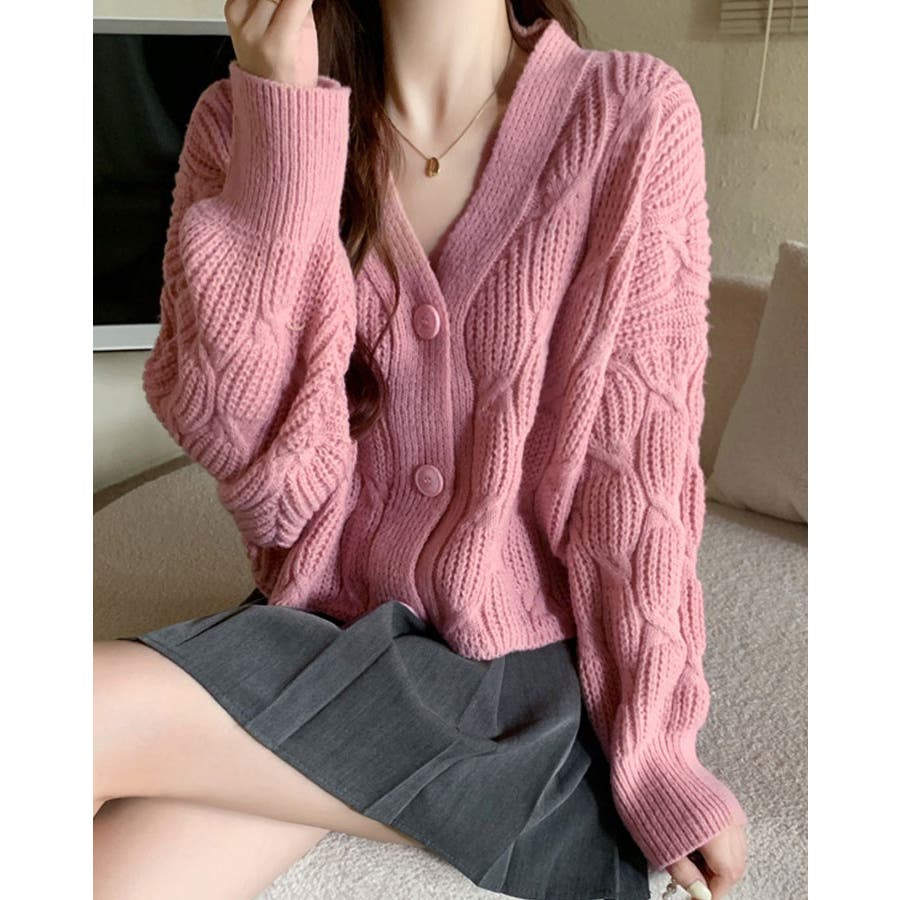 【ピンク】ウェーブ編みケーブルニットカーディガン トップス ニットカーディガン