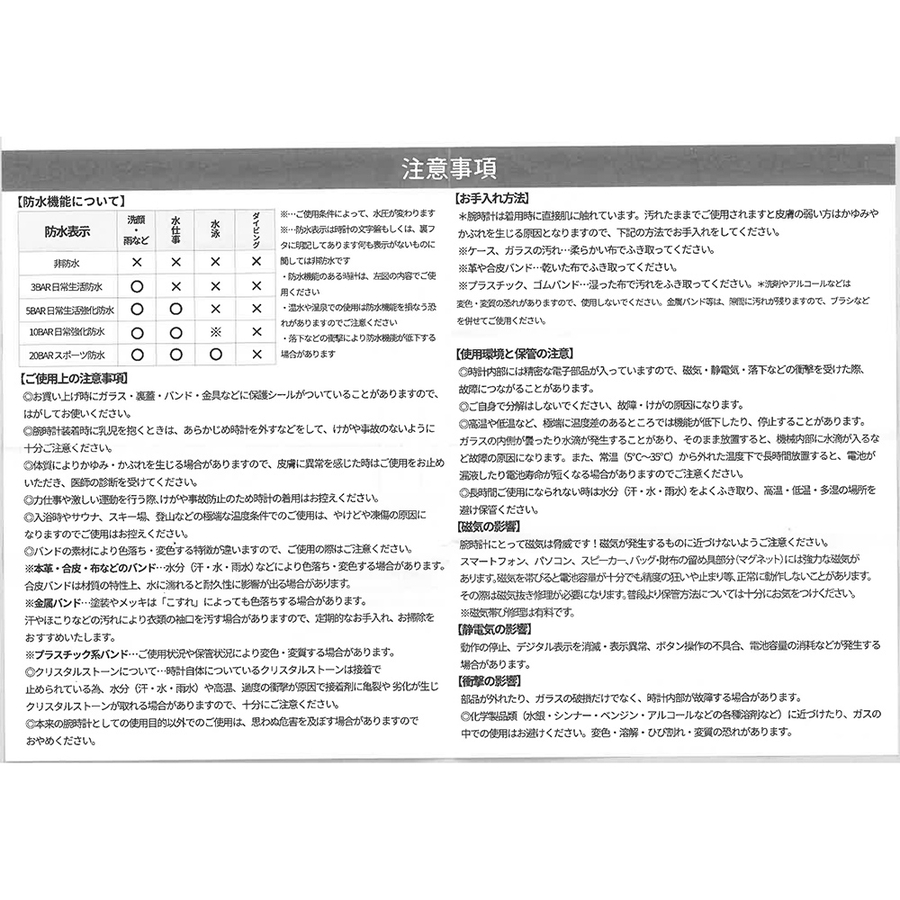 ・3気圧防水(日常生活防水)※「手を洗う」・「小雨がかかる」「汗をかく」などの日常で予想される少し水がかかる程度の場合に対応する防水です。