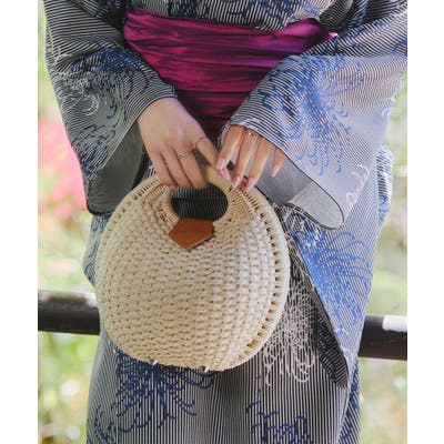 季節感あふれるナチュラルな風合いの雑材バッグ。かごバッグながらしっかりとした作りで型崩れにくい頑丈さ。大きく開くがま口タイプで荷物の出し入れがしやすく、見た目以上の収納力も魅力。デイリー使いから浴衣姿など様々なイベントシーンで使えるアイテムです。
