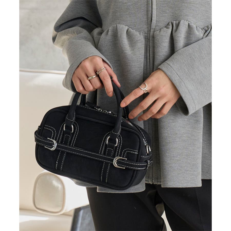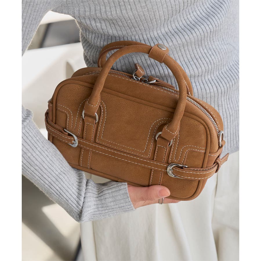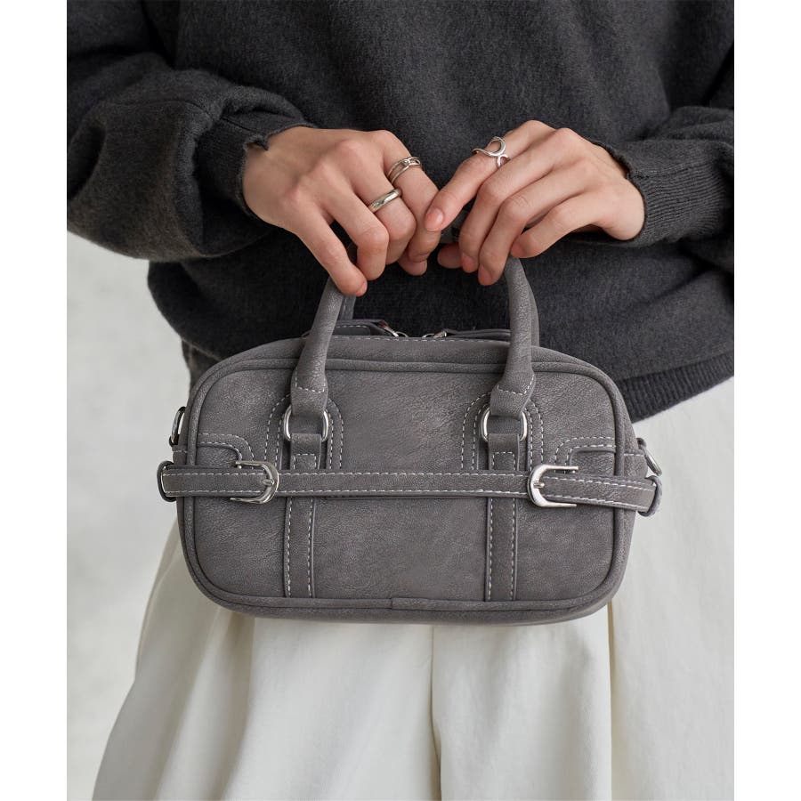 軽くて柔らかな質感のフェイクレザー素材。シボ感のあるマットな風合いに金具ベルトがリッチな表情に。カジュアルからモード、キレイめまでどんなスタイルにもマッチ、ショルダーバッグとしてハンズフリーでも持てるショルダーベルト付きです◎