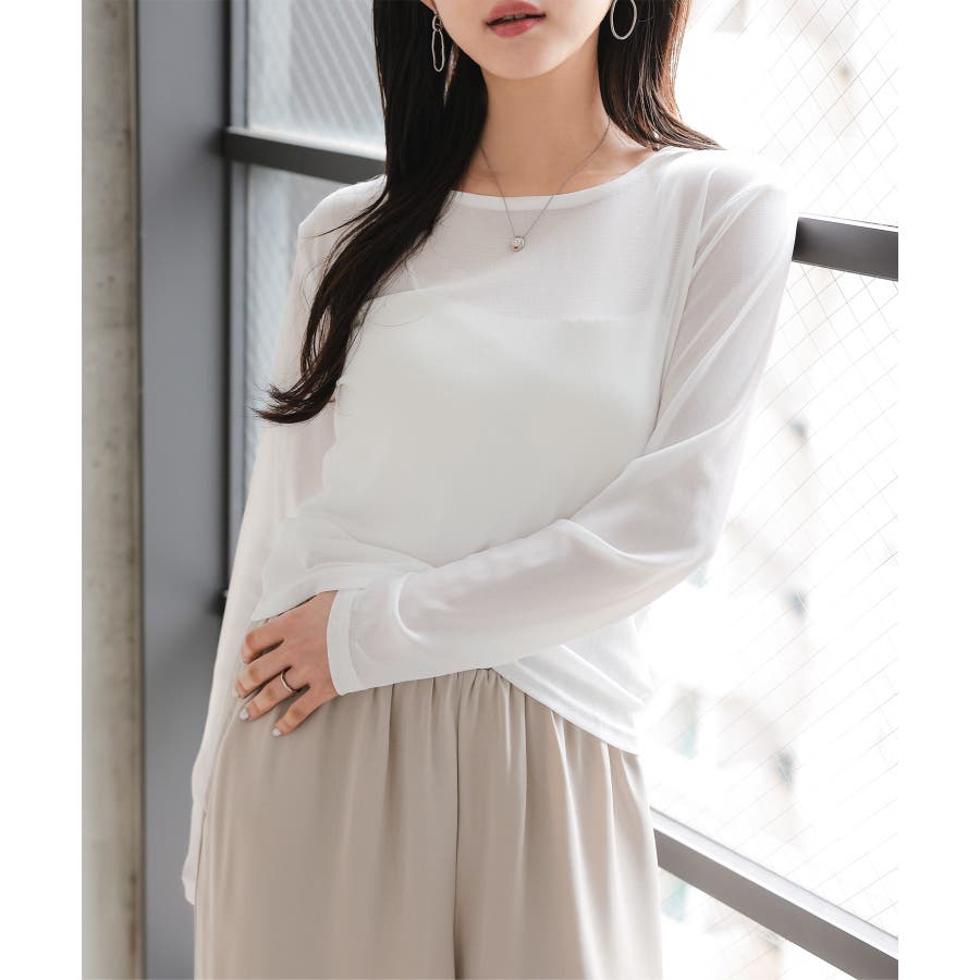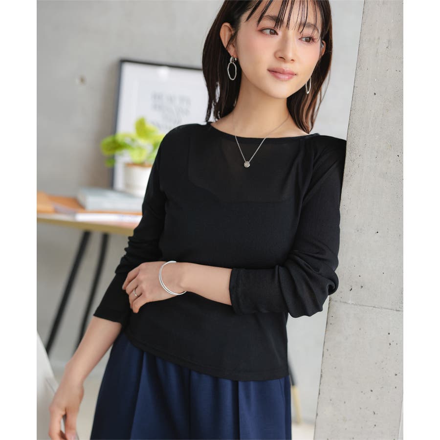 身体に沿いすぎない程よいシルエットで、インナーとしても一枚着としても着やすいサイズ感。身幅にはほんのりゆとりがあり、ラフに着こなしても動きやすさ◎着丈は腰骨あたりに収まり、タックインでもアウトでもバランスよくまとまります。シンプルながらきちんと感があり、オフィスコーデにも取り入れやすい一枚です。