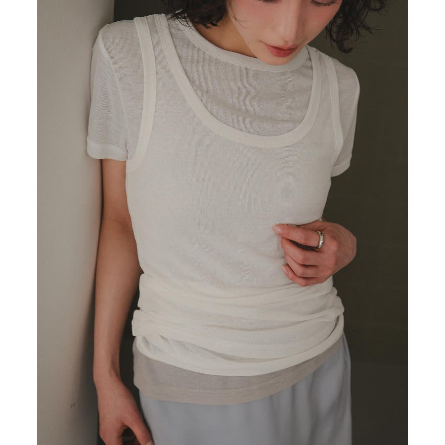 柔らかな質感のシアーカットソー素材。コンパクトながら身体になじみすぎない心地よいフィット感が魅力。程よい透け感がニュアンスのある表情に、着るだけでオシャレ見えしてくれるレイヤードトップスです。