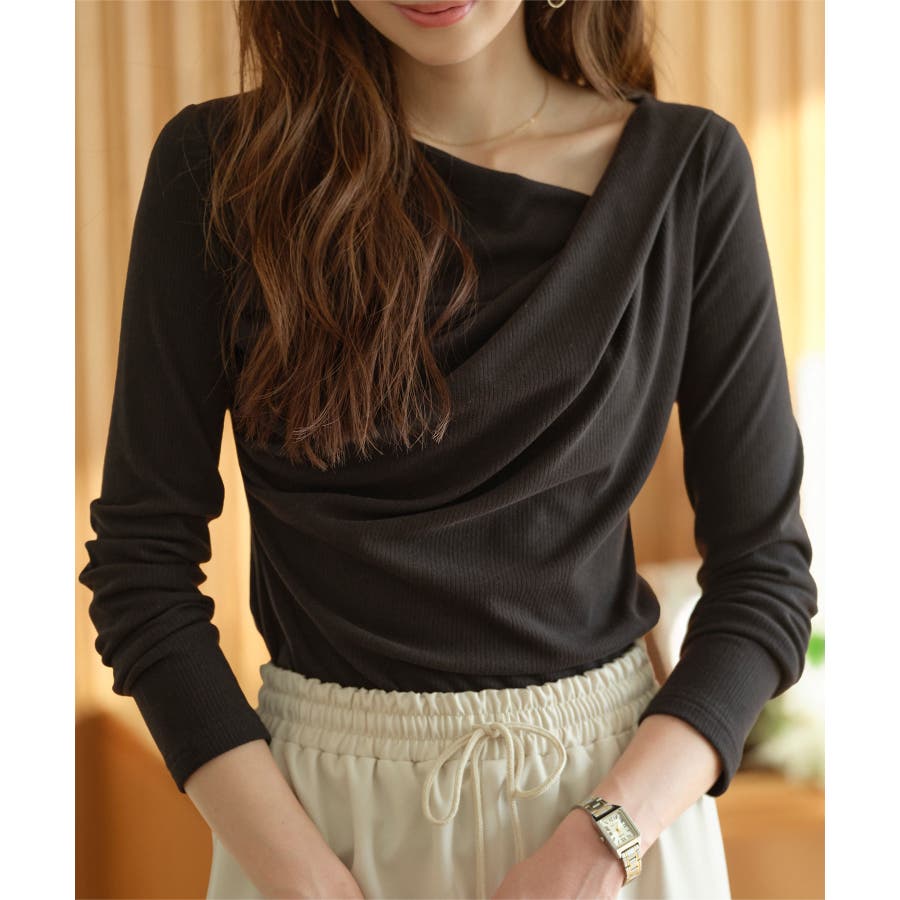 肌にやさしく馴染む柔らかさが心地よく、とろみ感がドレープの美しい立体感を表現。キレイめな印象ながらストレッチ性のあるリブ生地で着心地よくお手入れもしやすいトップスです。
