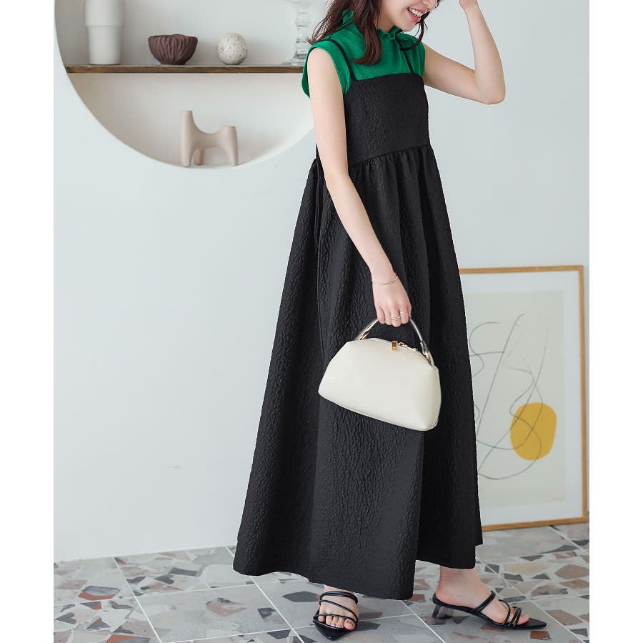 高級感のあるふくれジャガード生地を採用。程よくハリがあり、体系カバー効果も期待できます。ポリエステル素材でご自宅でお手入れしやすいのも魅力のひとつ。キャミソールタイプは肩紐の結び方次第で長さ調整が、ジャンスカタイプはリボンの結び方次第でギャザー感の調整が可能です◎。