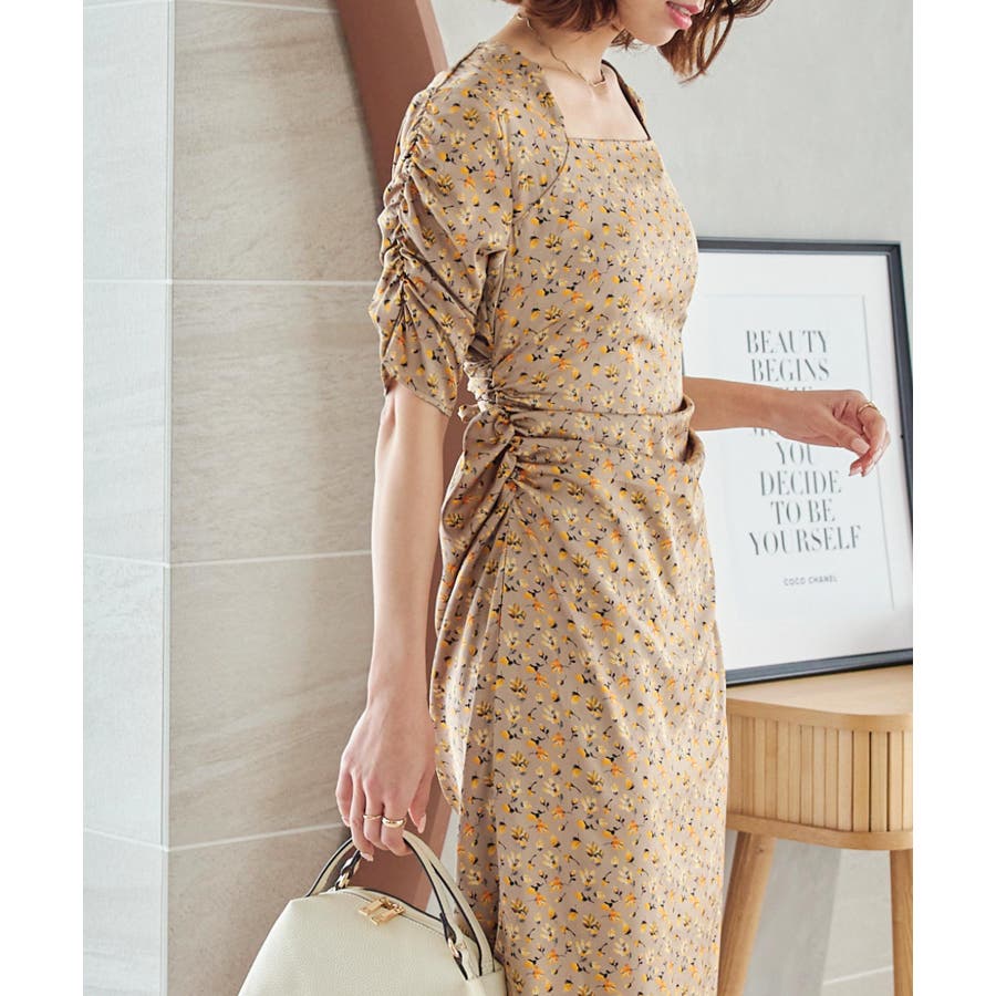 【ベージュ】華奢見えオプティカルフラワーワンピース[E3283]