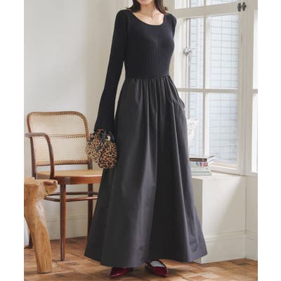 トップス部分はニット素材、スカートは布帛生地で仕立てた異素材ドッキング。フィット&フレアのメリハリシルエットがうれしいスタイルアップ効果も。カジュアル感とフェミニンさを兼ね合え様々なテイストにスタイリングしやすいロングワンピースです。