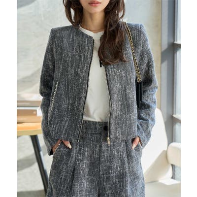 エレガントな表情が魅力のツイード素材。程よい厚みと柔らかな生地感でリラックスした着心地の良さも魅力。タートルやハイネックトップスとも相性よく女性らしさ引き立ててくれるノーカラージャケットです。同素材のショートパンツ【M4349】とセットアップでの着用もおすすめです。