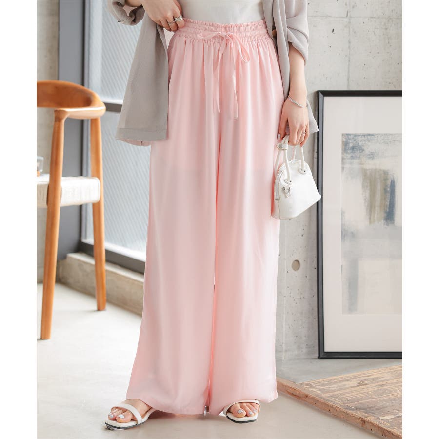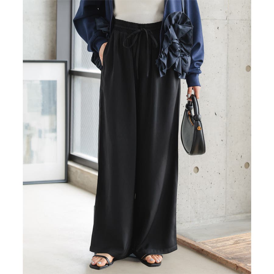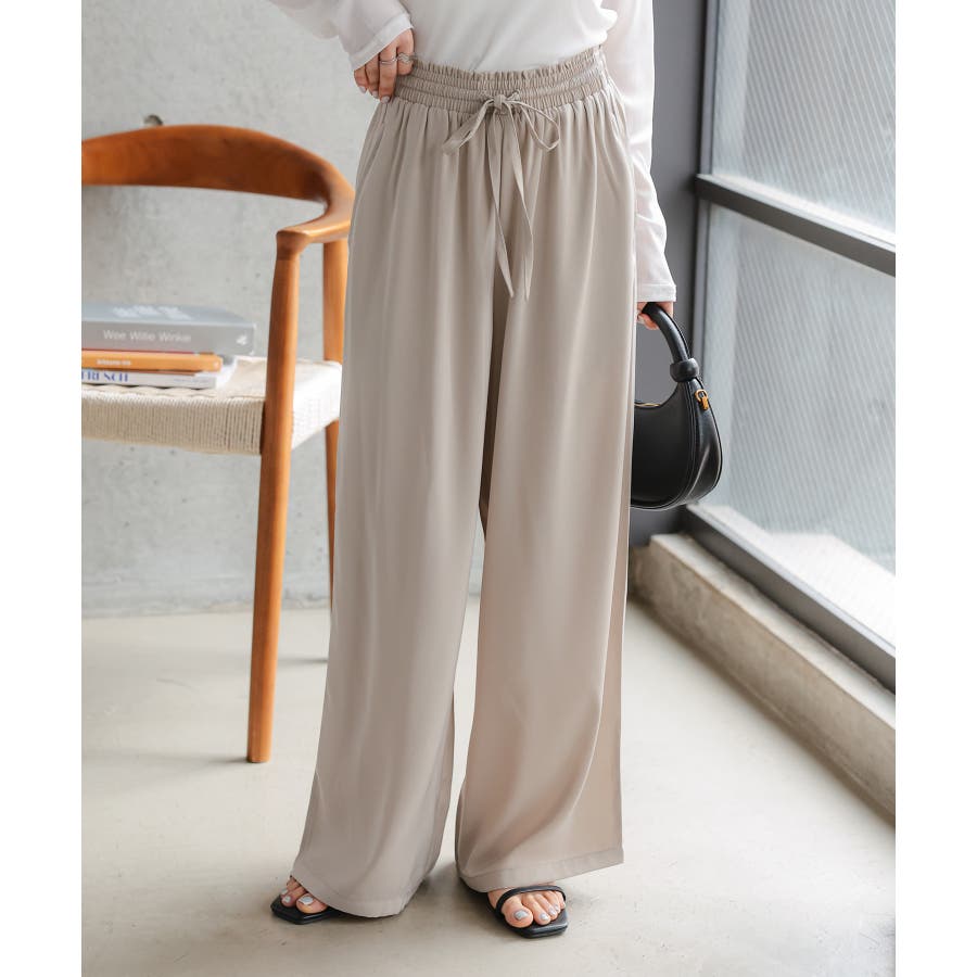 ウエストは総ゴム×リボンで位置調整もしやすく、重心を上げて脚長見えが叶います。ほんのり光沢のあるとろみ生地で、イージーパンツでも部屋着っぽくならず上品。淡色でも軽やかに見えて、オフィスカジュアルやきれいめコーデにもそのまま馴染みます。