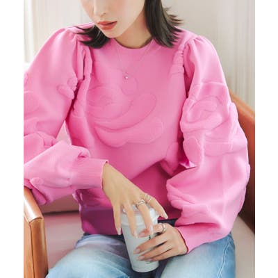 ドライタッチなスポンディッシュ素材にふわふわのボア地でバラモチーフを表現。コンパクトな身頃にボリューミーなパフスリーブのメリハリシルエットがポイント。カジュアルにも大人可愛いくも着こなせるクルーネックニットです。