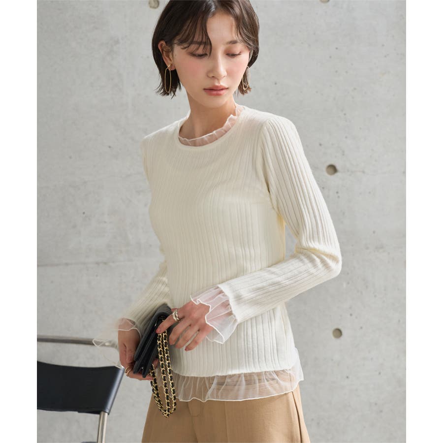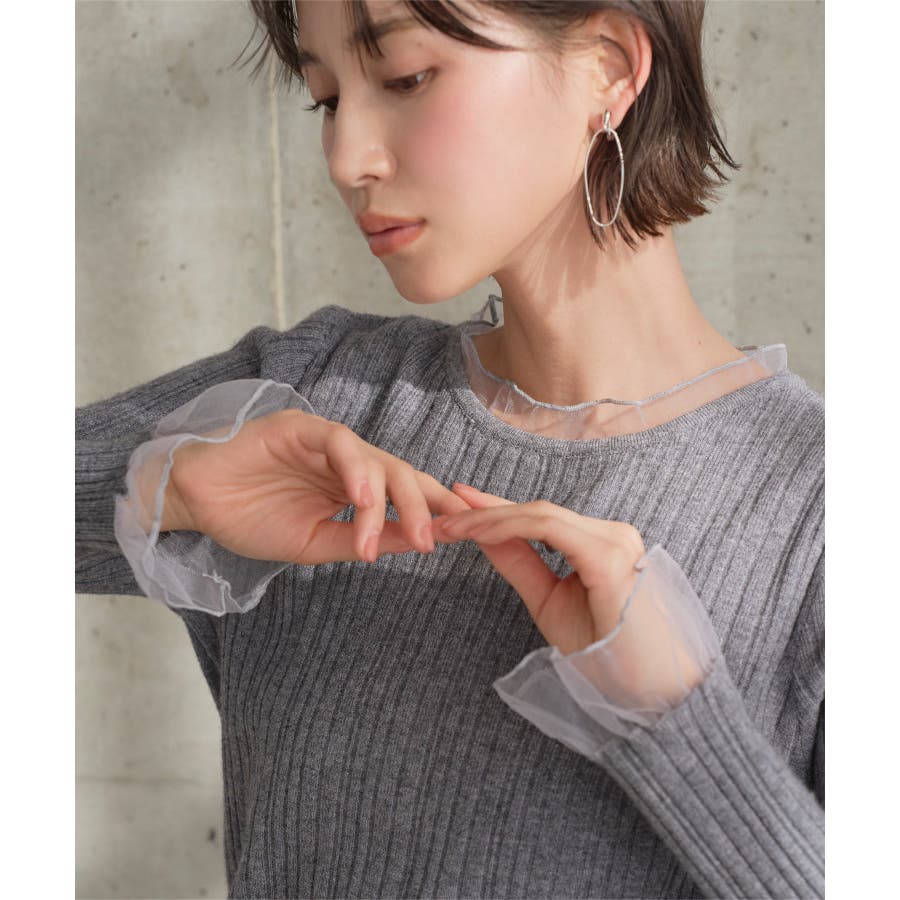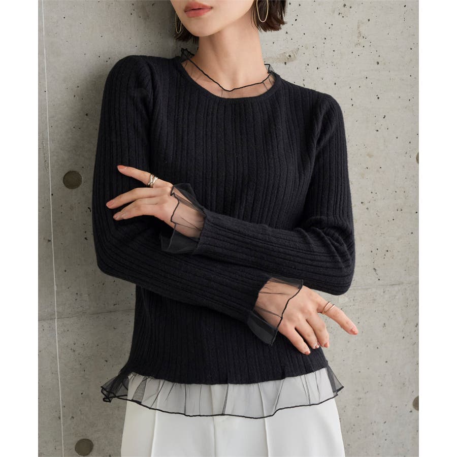 肌にやさしく馴染むリブニットとシアーチュールの異素材ドッキングデザイン。甘すぎないシアーフリルが手元や首元に華やかさをもたらし印象的な雰囲気に。ジャケットやコートなどアウターを羽織っても女性らしさ引き立つ一枚です◎