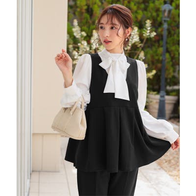 ベストとボトムは伸縮性のあるカットジョーゼット生地。ブラウスは上品な光沢感で柔らかいサテン素材でお仕立てしました。ベストはVネックと丸首の前後2way、ブラウスはリボンを前後どちらでも結んでいただけるので、組み合わせ次第で様々なスタイリングが可能です。ヒップの隠れる丈も嬉しいポイント◎ボトムはウエストベルト部分にゴムを内蔵しており、1日中穿いていてもストレスフリー。