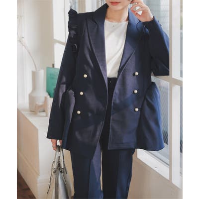 ハリのある生地感でお仕立てしたジャケット。サイドの切替のボリュームやパールボタン、フリル使いなど女性らしさディテールをプラス。ブラウスはカッティングにこだわり、三角マチでフレアシルエットを出しています。ジャケットと同素材のパンツは裾のスリットとピンタックで美脚効果も◎
