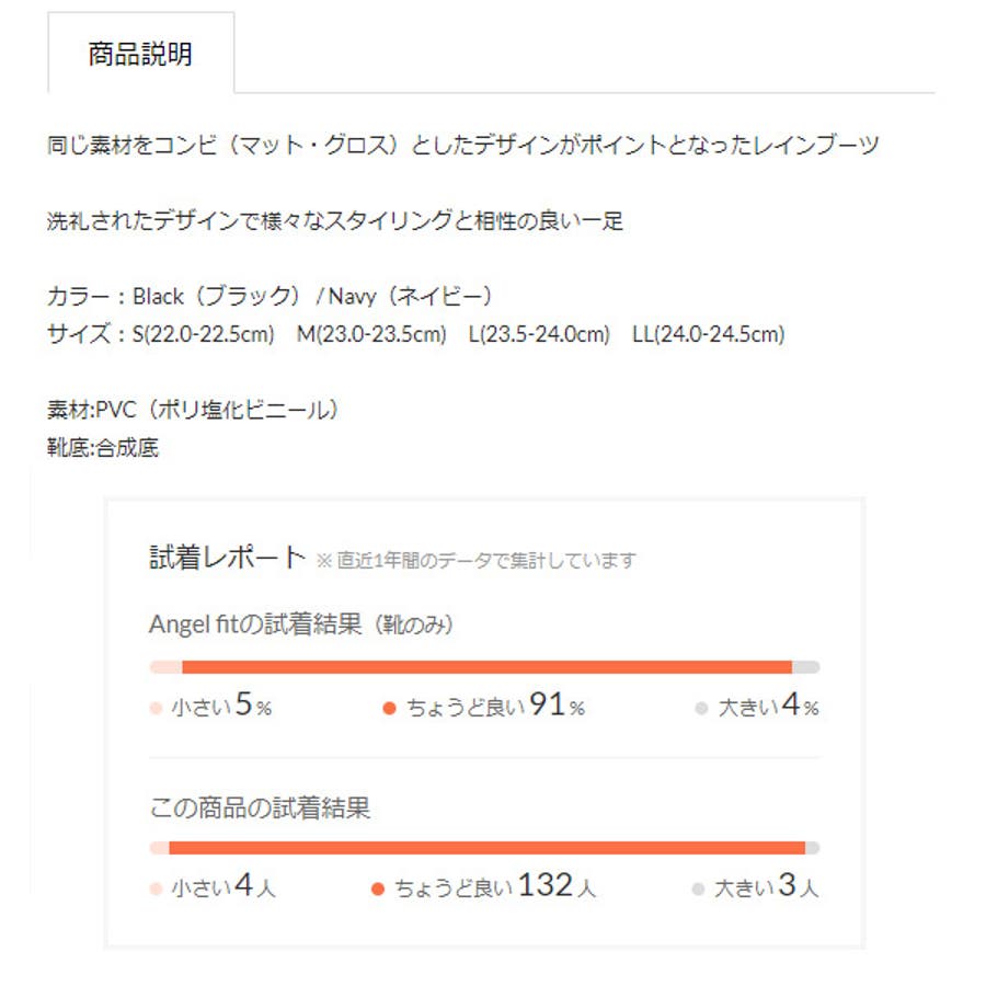 | サイズ | S(22.0-22.5cm) / M(23.0-23.5cm) / L(23.5-24.0cm) / LL(24.0-24.5cm) |