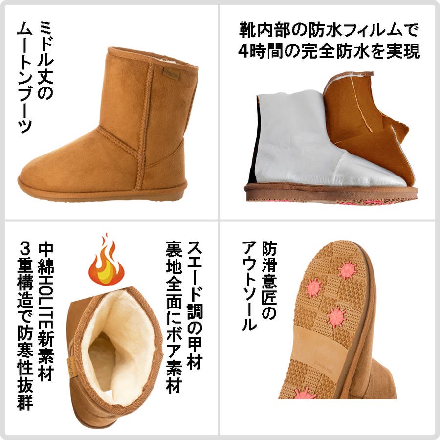 一般的なムートンブーツは雨や雪が靴内まで浸み込みやすく、本来温かいハズのボアまで濡れて大変な思いをされた方も多いと思います。