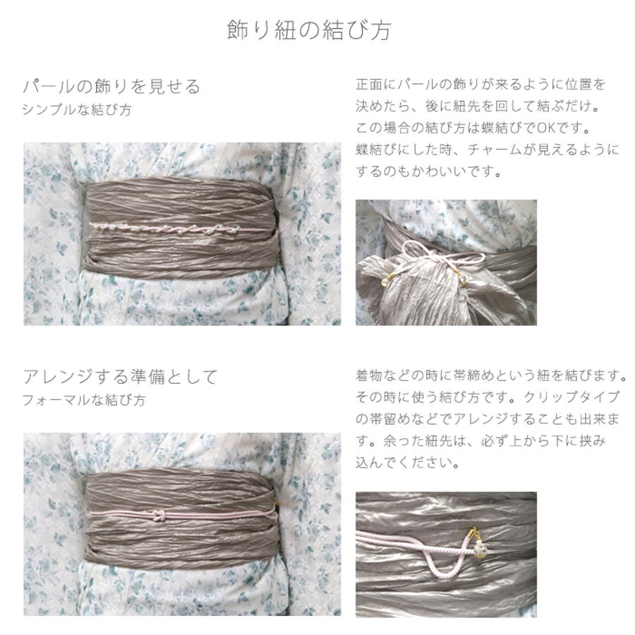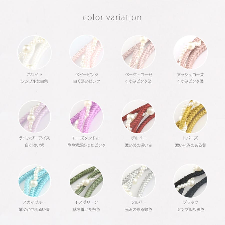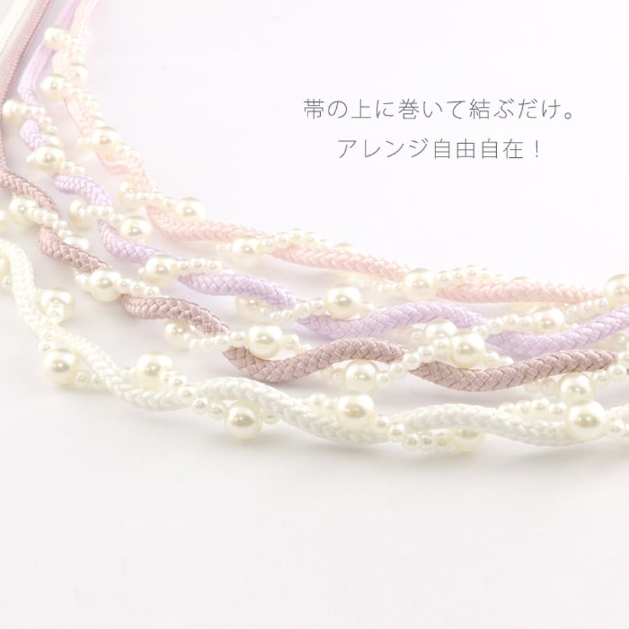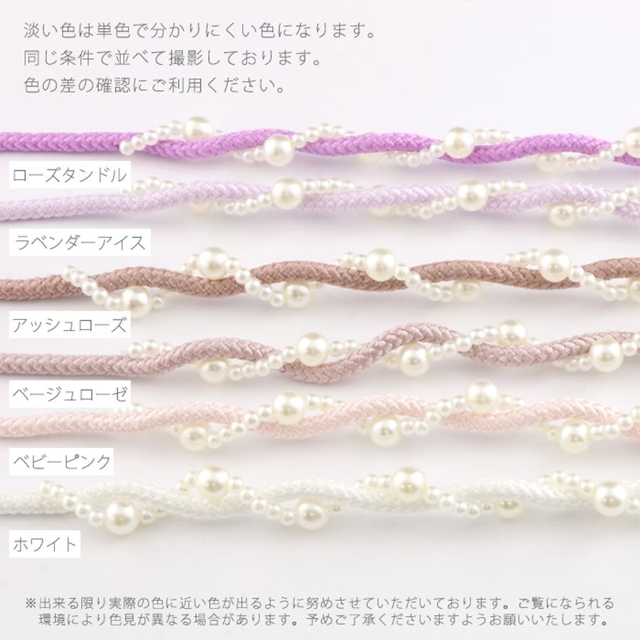 【カラー】全12色ホワイト:シンプルな白ベビーピンク:白く淡いピンクベージュローゼ:くすみピンク淡アッシュローズ:くすみピンク濃※ベビーピンク→ベージュローゼ→アッシュローズの順番で濃くなっていきます。ラベンダーアイス:白く淡い紫ローズタンドル:やや紫がかったピンクボルドー:濃いめの深い赤トパーズ:濃い赤みのある黄スカイブルー:鮮やかで明るい青モスグリーン:落ち着いた苔色シルバー:光沢のある銀色ブラック:シンプルな黒【サイズ】長さ:約156cm※商品の仕様上、多少伸縮しますので誤差がある場合があります。【材質】ポリエステル100%【ご注意ください】本商品にはパール調の飾りが付いています。そのため、フォーマル結びなどをした後に帯締め/飾り紐を回すことが出来ません。無理に回そうとした場合、帯が傷ついたりパール調の飾りが取れたり、破損の原因となります。お取り扱いにはご注意ください。