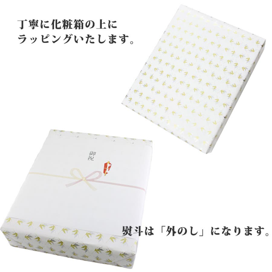 化粧箱に包装紙でラッピングし、熨斗を付けた後、エアパッキンをいたします。