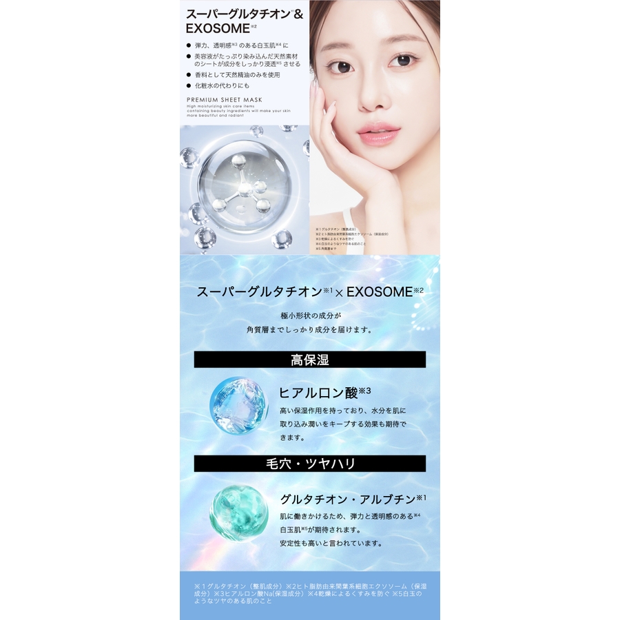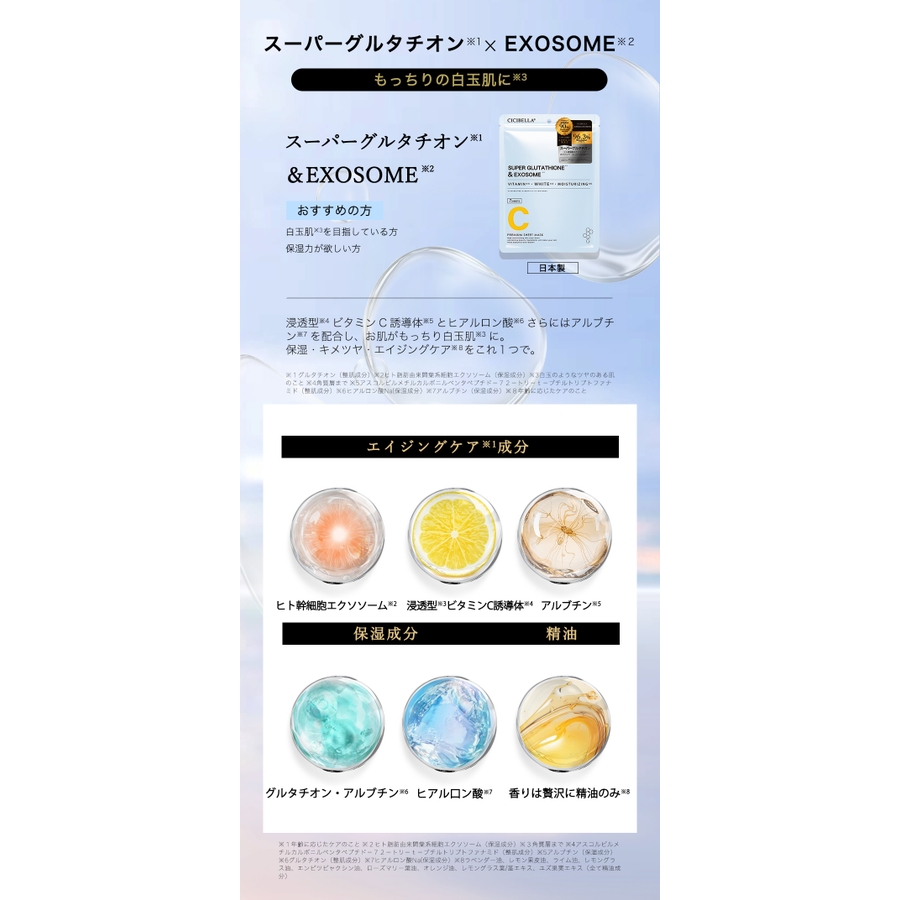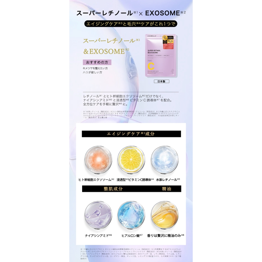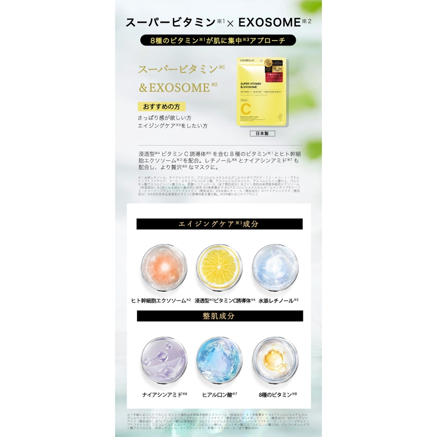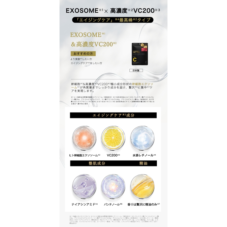 | タイプ | スーパービタミン×EXOSOME / スーパーレチノール×EXOSOME / スーパーグルタチオン×EXOSOME / VC200xEXOSOME |